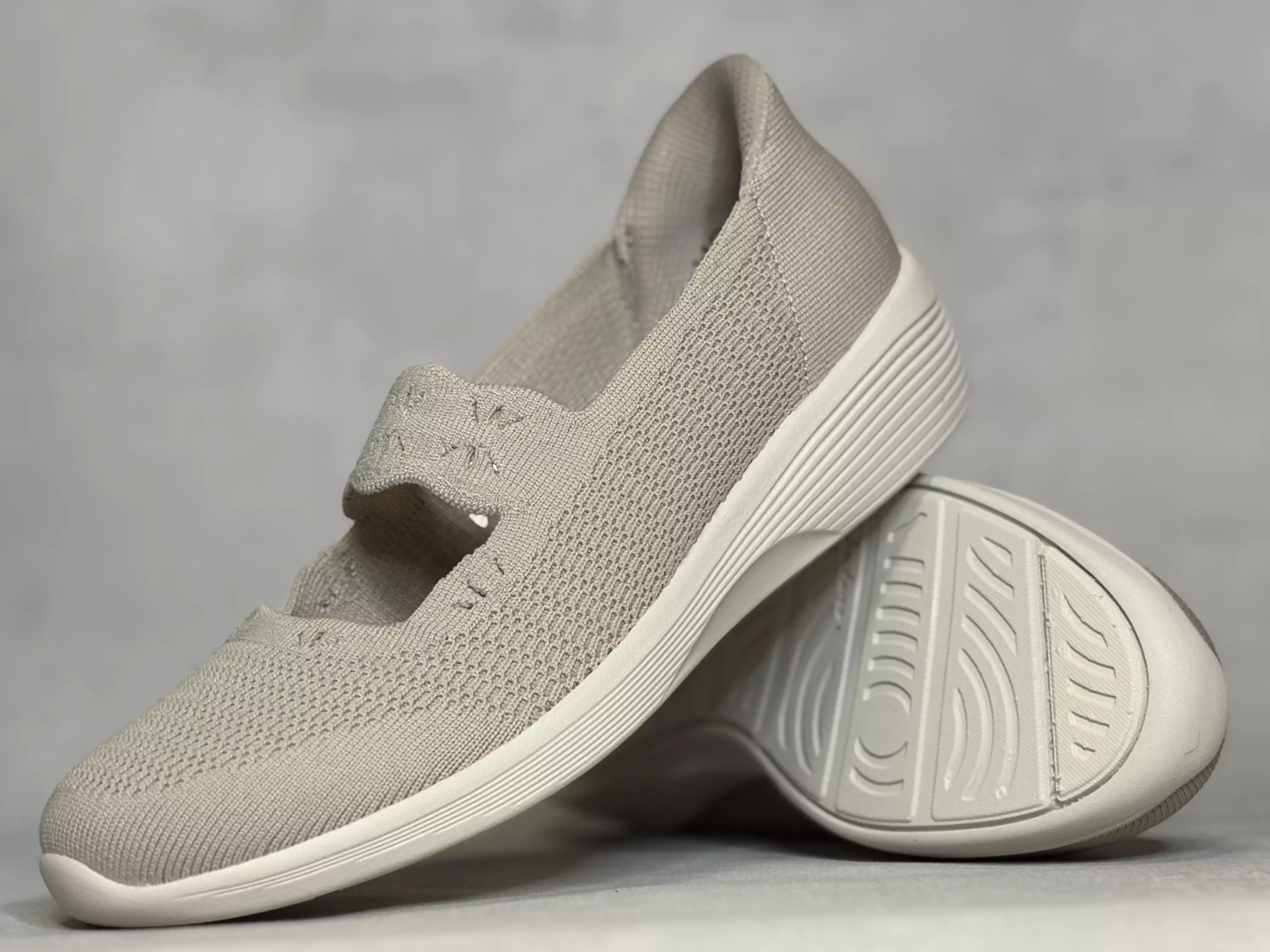 Beiget Skechers Arya - Subtle Gleam kävelykengät. Slip-ins kenkälusikkakannalla varustetut tekstiiliset kävelykengät. Joustava pääliremmi. Normaali lesti, Skechers classic fit. Kannan korkeus noin 4cm ja pohjan korkeus päkiän alta noin 1cm