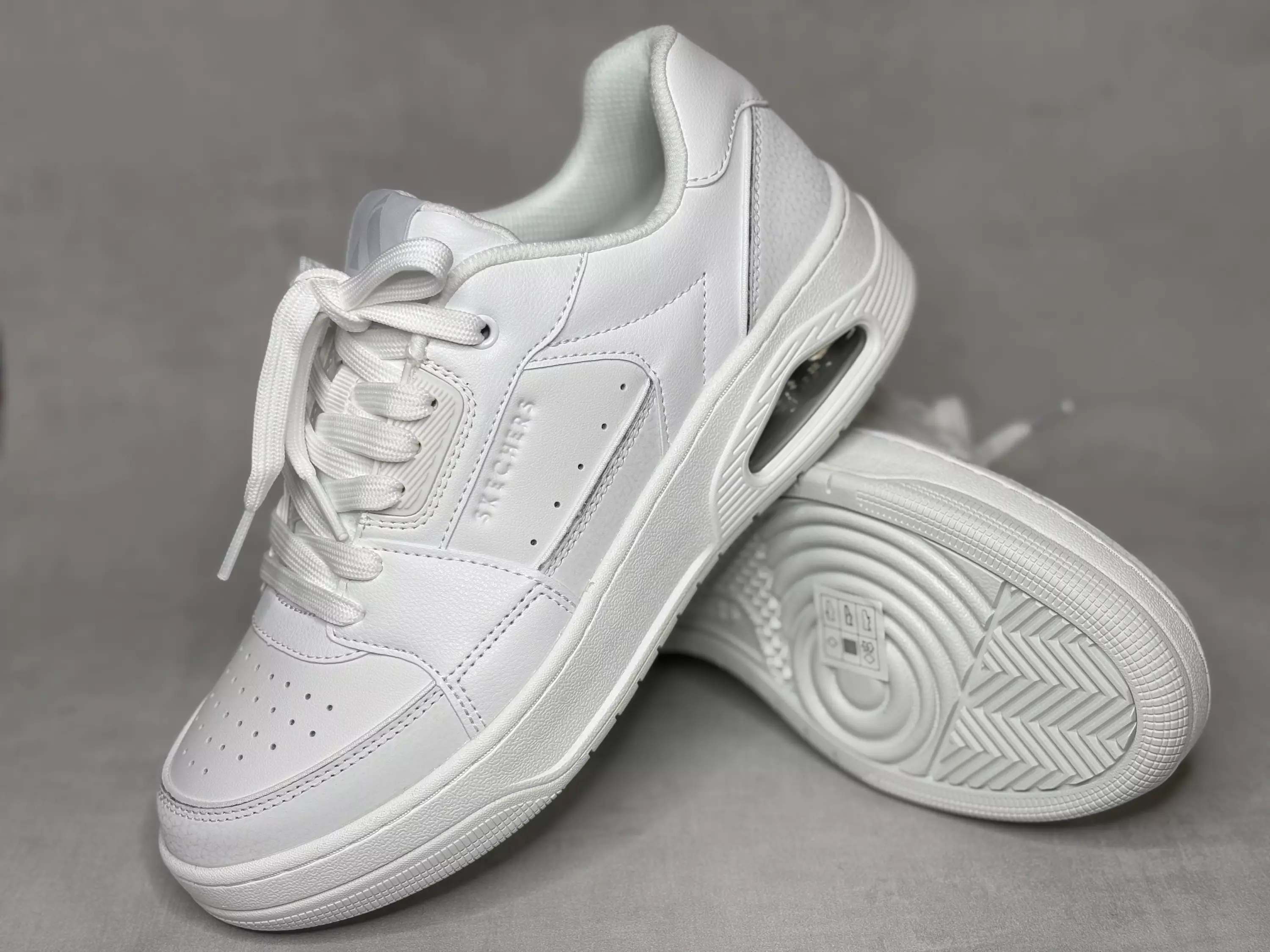 Valkoiset Skechers Uno Court - Courted lenkkarit. Tennareiden pinnassa yhdistyy nahka ja synteettinen materiaali, näyttävät leikkaukset ja varsin paksu ulkopohja. Kannan alla iskunvaimentava Skech-air ilmatyyny. Kannan korkeus noin 4cm ja pohjan korkeus päkiän alta noin 2,5cm.