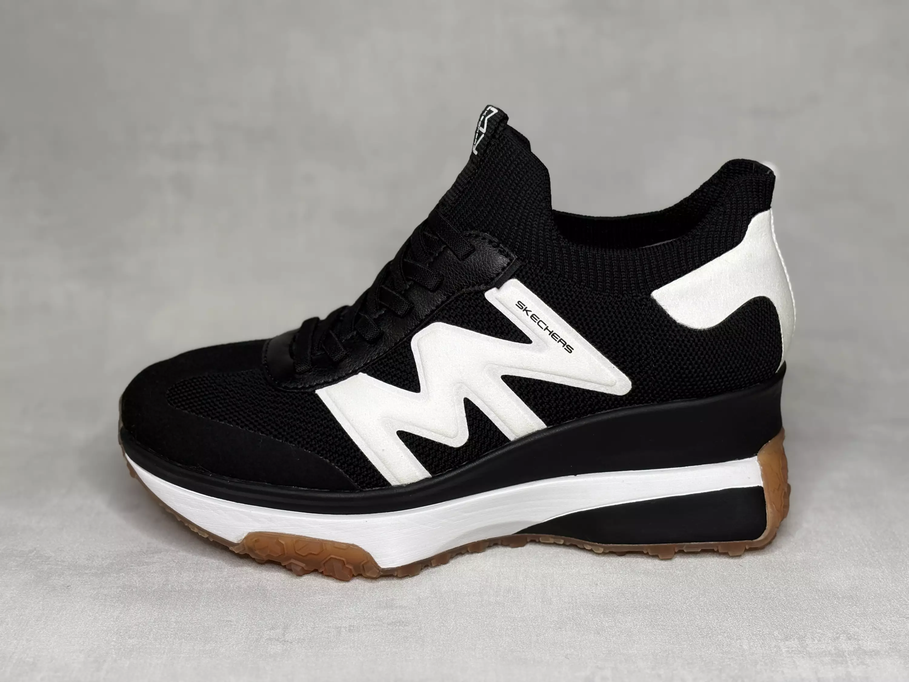 Mustat Mark Nason Skechers Upper Cut Neo Wedge - Juni lenkkarit. Näyttävällä kiilapohjalla varustetut matalavartiset tennarit. Pohjan ulkosivut ovat väriltään mustavalkoiset ja kannan alla ulkopohjan vaaleanruskea nousee näkyville. Joustava tekstilinen kengänsuu ja tekstiilinen pinta. Ulkosyrjällä ja kannassa valkoiset yksityiskohdat. Joustavat venykenauhat (ei säädettävissä). Kannan korkeus noin 6cm ja pohjan korkeus päkiän alta noin 2cm.