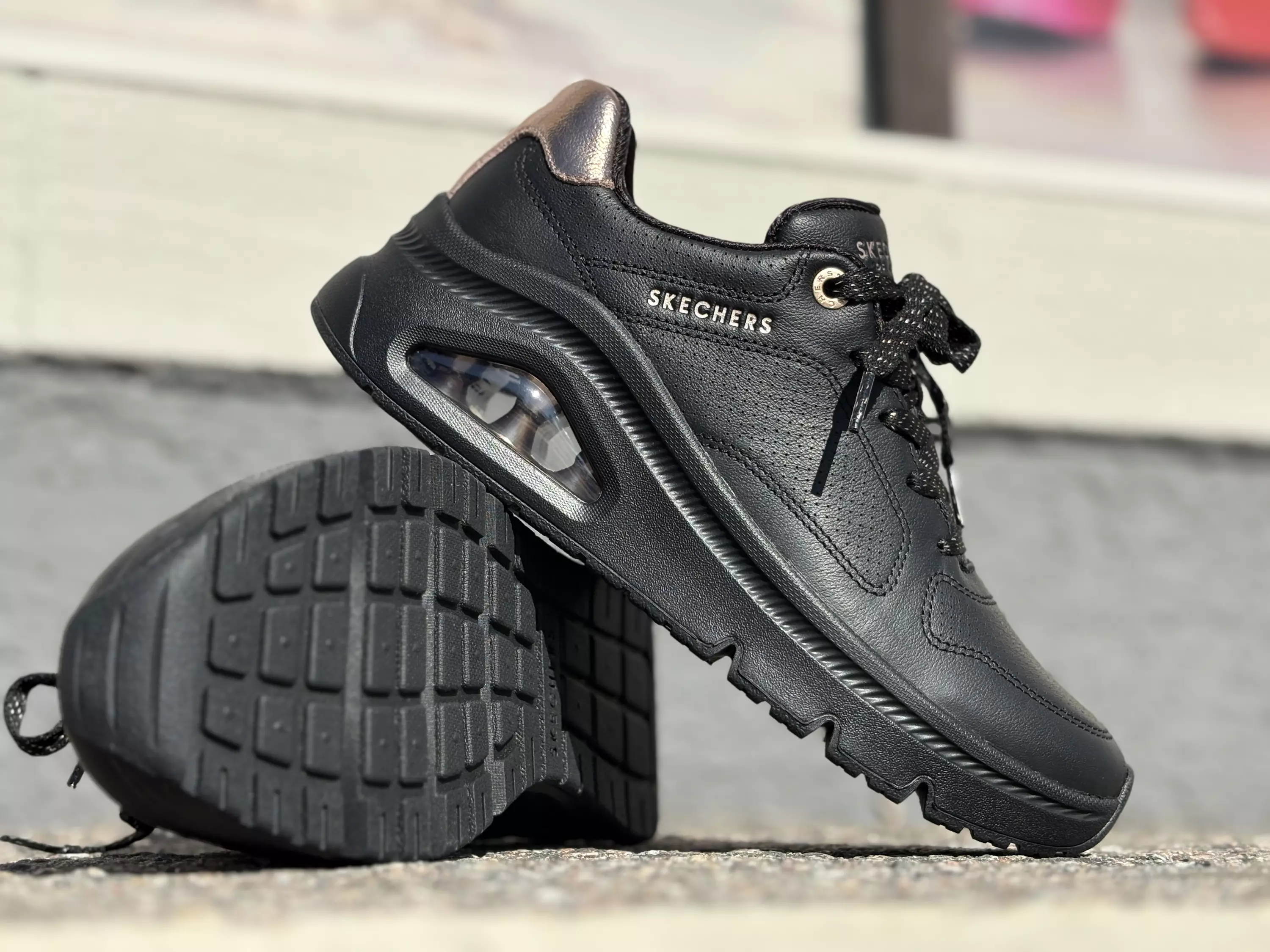 Mustat Skechers - Uno Icon - Idolized Air - Black lenkkarit. Nahkapinta ja kultaiset aksenttivärit kenkien kannassa, sivuissa ja iltissä antavat kengille upean ilmeen! Nauhojen avulla kenkä säätyy omaan jalkaan sopivaksi.