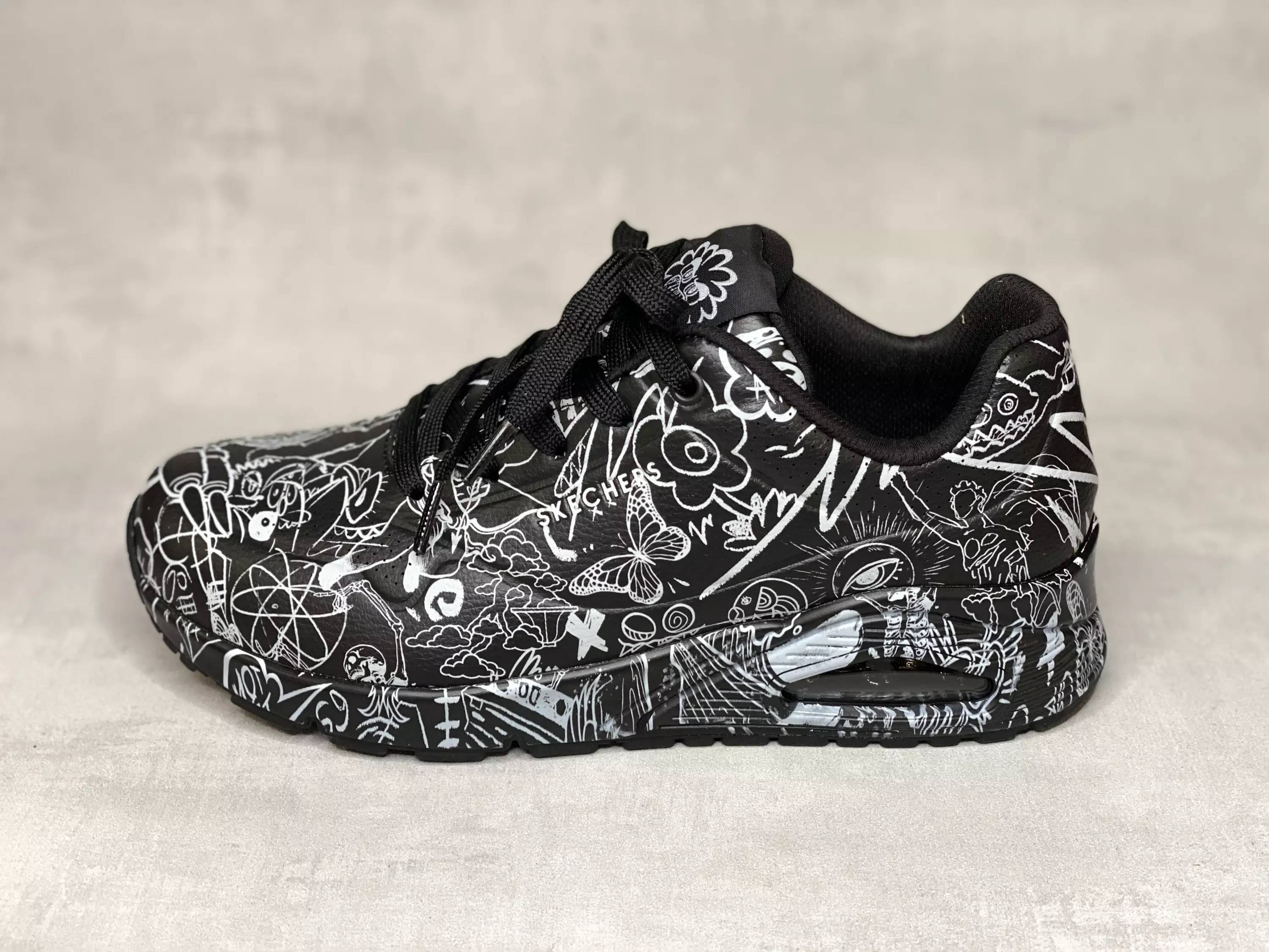 Mustat Skechers x Vexx Uno - Process Sketch lenkkarit. Skechers x Vexx yhteistyömallisto! Näyttävät mustat lenkkarit luonnosmaisilla valkoisilla kuvioilla. Kuvio kulkee koko kengän läpi, sisäpohjallista ja ulkopohjien sivuja myöten!