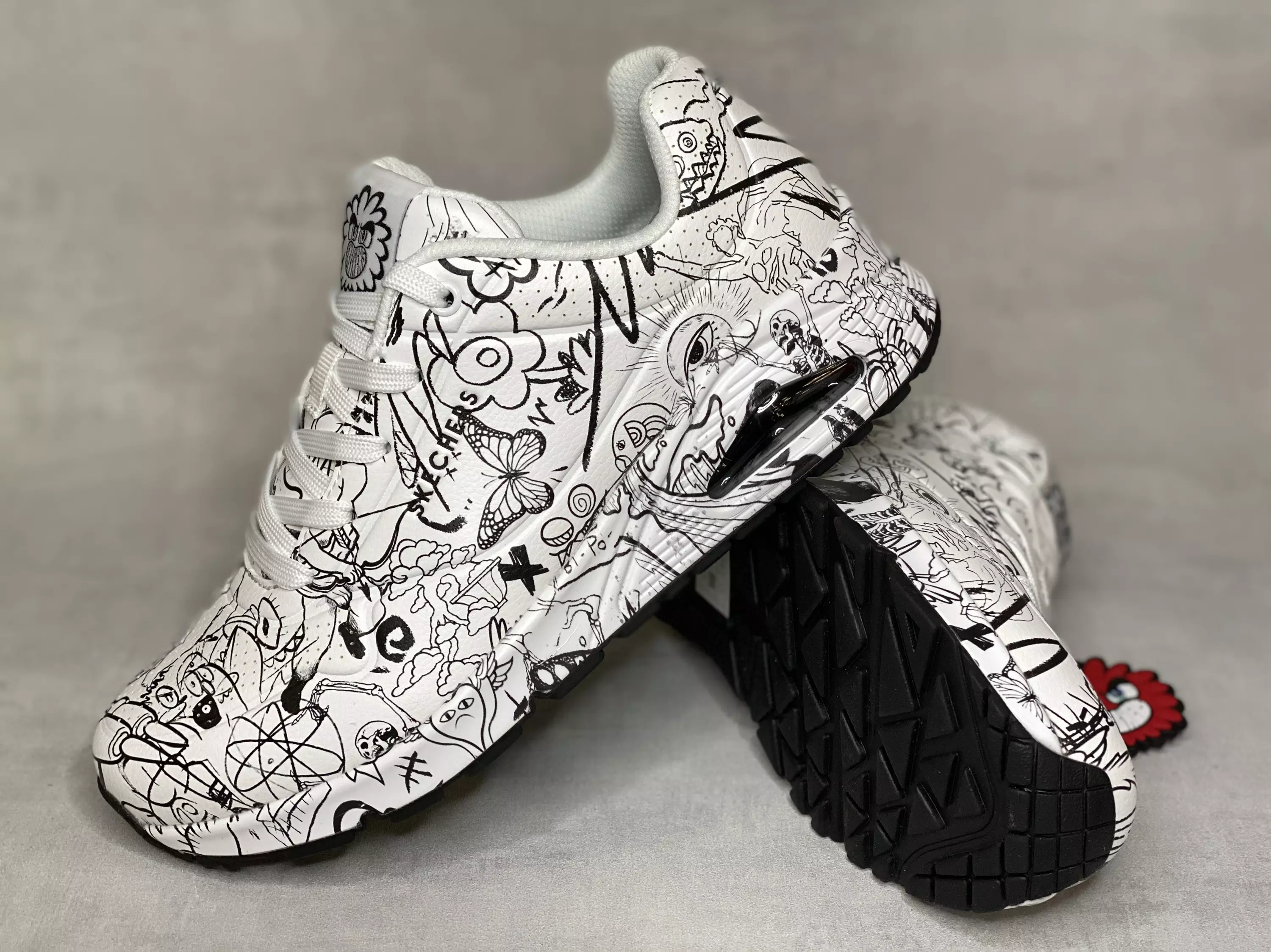 Valkoiset Skechers x Vexx Uno - Process Sketch lenkkarit. Skechers x Vexx yhteistyömallisto! Näyttävät valkoiset lenkkarit luonnosmaisilla mustilla kuvioilla. Kuvio kulkee koko kengän läpi, sisäpohjallista ja ulkopohjien sivuja myöten!