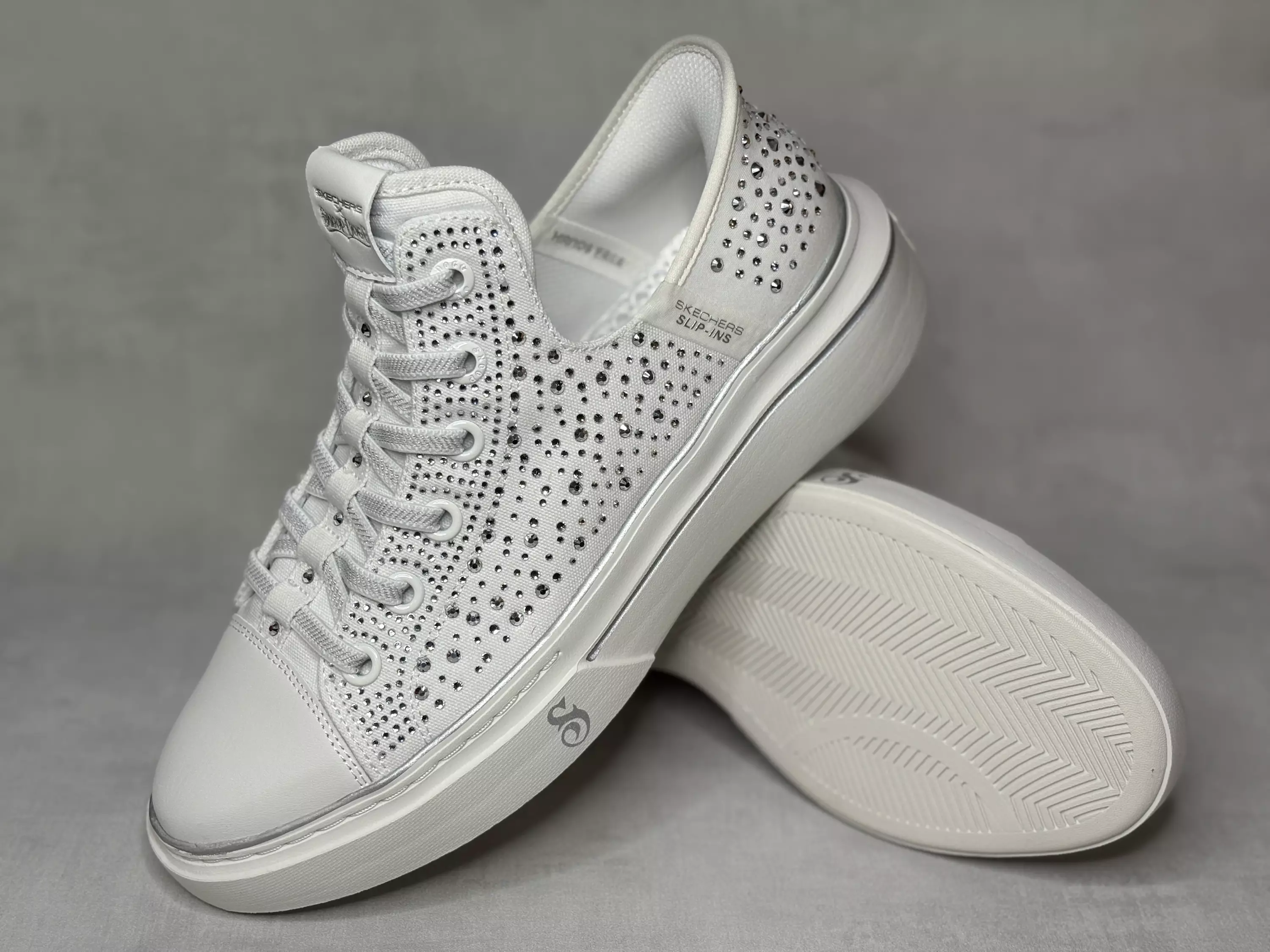 Valkoiset Skechers x Snoop Dogg - Snoop One - Rhine-Stoned Slip-ins tennarit. Häikäisevän upeat strassikoristeiset tennarit! Slip-ins kenkälusikkakanta vauhdittaa pukemista ja kannan Heel Pillow auttaa jalkaa pysymään paikoillaan kengässä. Ylipitkä iltti ja kengän valkoinen kärki antavat tälle Skechers x Snoop Dogg tennarille lisäilmettä! Pohjan yläreunassa pinkki raita ja kärjessä pinkit tikkaukset.
