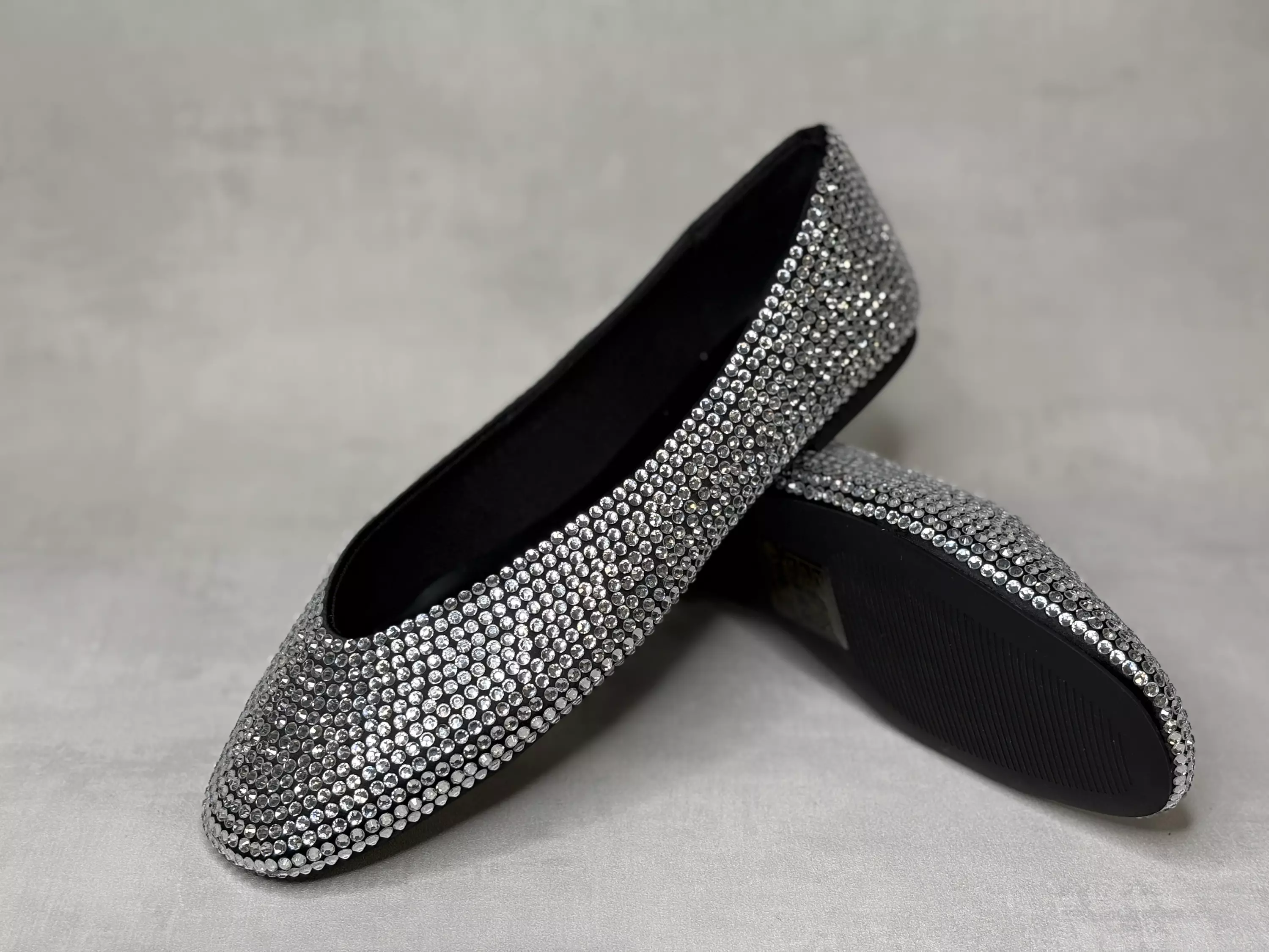 Hopeisilla strasseilla koristetut Steve Madden Darts ballerinat. Pohjaväriltään mustat ballerinat ovat saaneet koristuksekseen upeasti sädehtivät hopeiset strassit. Kannan korkeus noin 1cm ja pohjan korkeus päkiän alta noin 0,5cm.