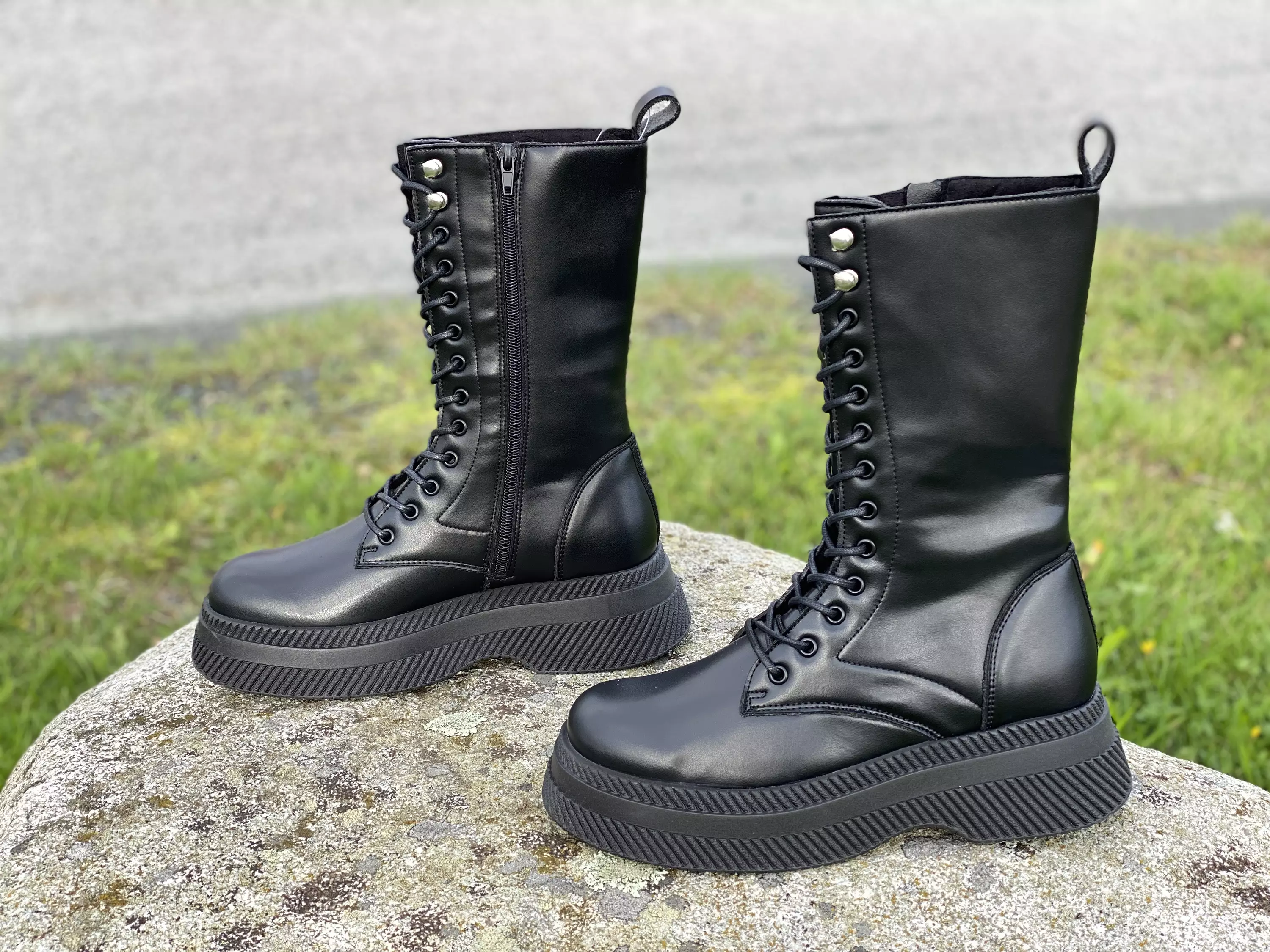 Mustat Steve Madden Giulia maiharit. Pitkävartiset maiharit paksulla pohjalla! Mustien sirkkarenkaiden läpi kulkevien nauhojen avulla kenkä säätyy pohkeeseen sopivaksi ja varren sisäsyrjälle sijoitettu vetoketju helpottaa pukemista. Paksu ulkopohja antaa näille maihareille varsin räyhäkkään ilmeen! Varren yläreunassa metallinväriset nauhalenkit.