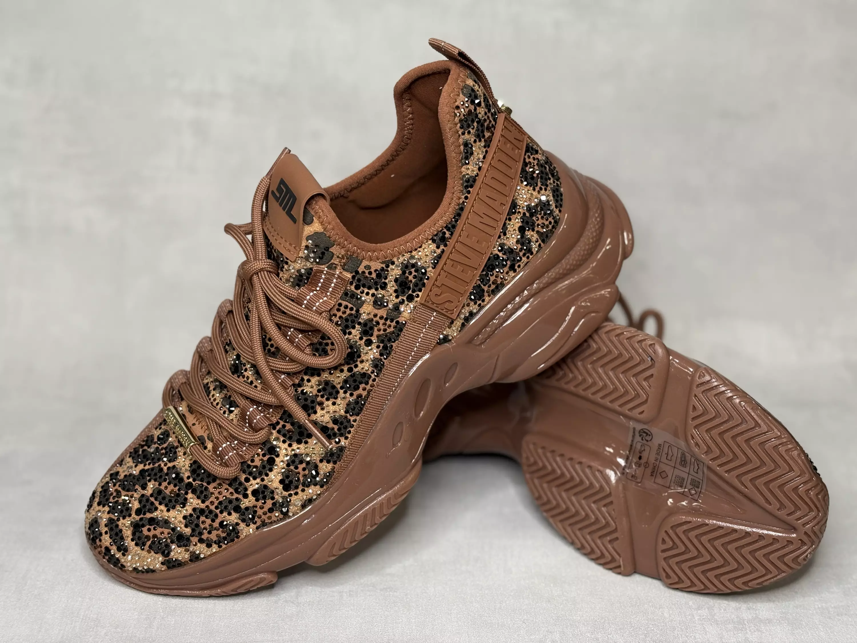 Leopardi kuosisset upeasti kimaltavat Steve Madden Mistica lenkkarit! Ärhäkästi muotoiltu ruskea ulkopohja, kengän pinnassa puolestaan lyömätön eriväristen strassien kimalluksen liitto! Käännä katseet, erotu joukosta ja kirmaa kesään kimaltavat kengät jalassa! Vaihdettavien pohjallisten ansiosta voit tarvittaessa vaihtaa näihin lenkkareihin omiin jalkoihisi parhaiten istuvat pohjalliset.