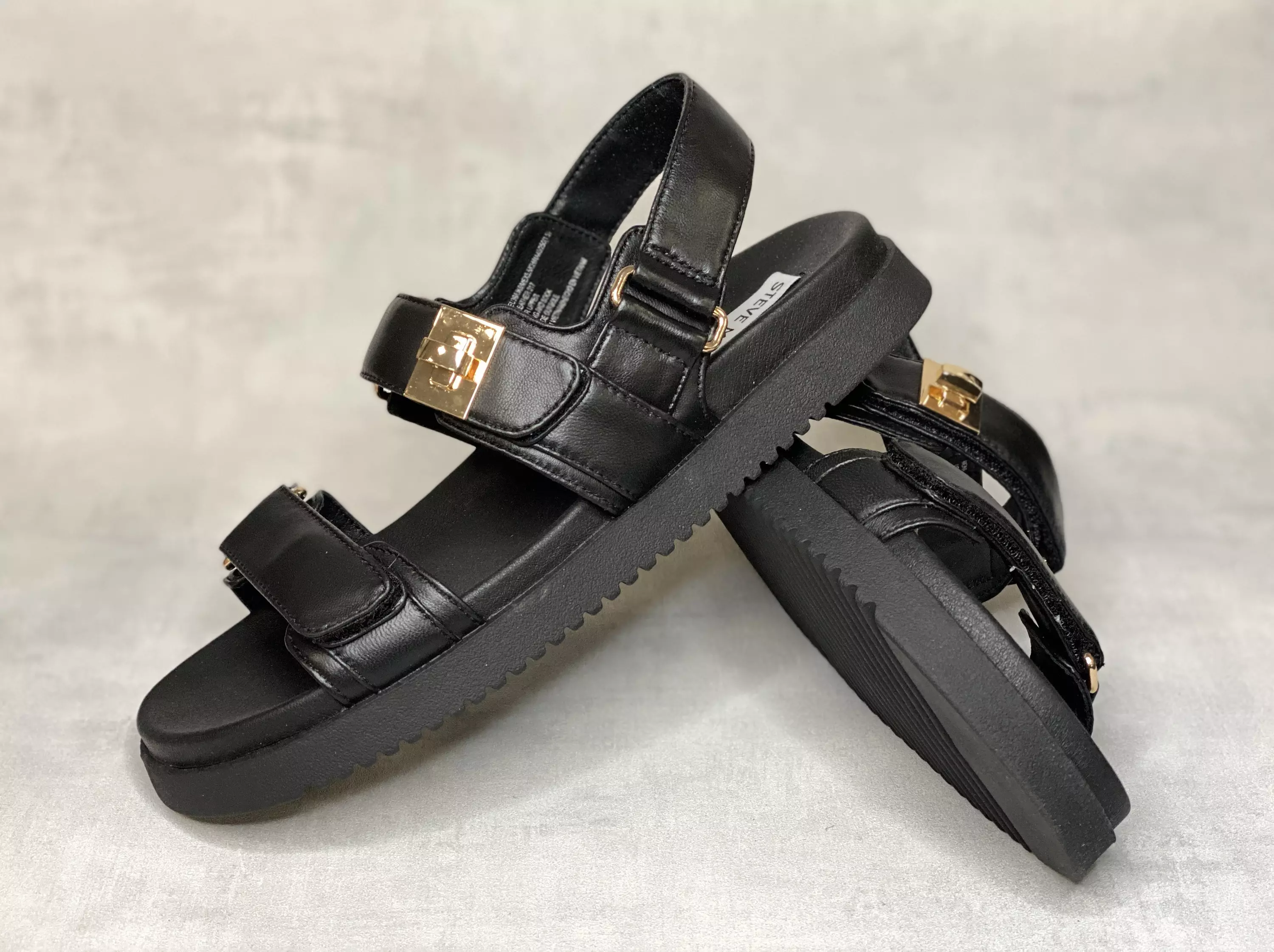 Mustat Steve Madden Mona sandaalit. Kahdella tarrasäätöisellä remmillä varustetut nahkapintaiset sandaalit. Kullanväriset metalliosat viimeistelevät kenkien ulkonäön! Kevyesti muotoiltu sisäpohja.