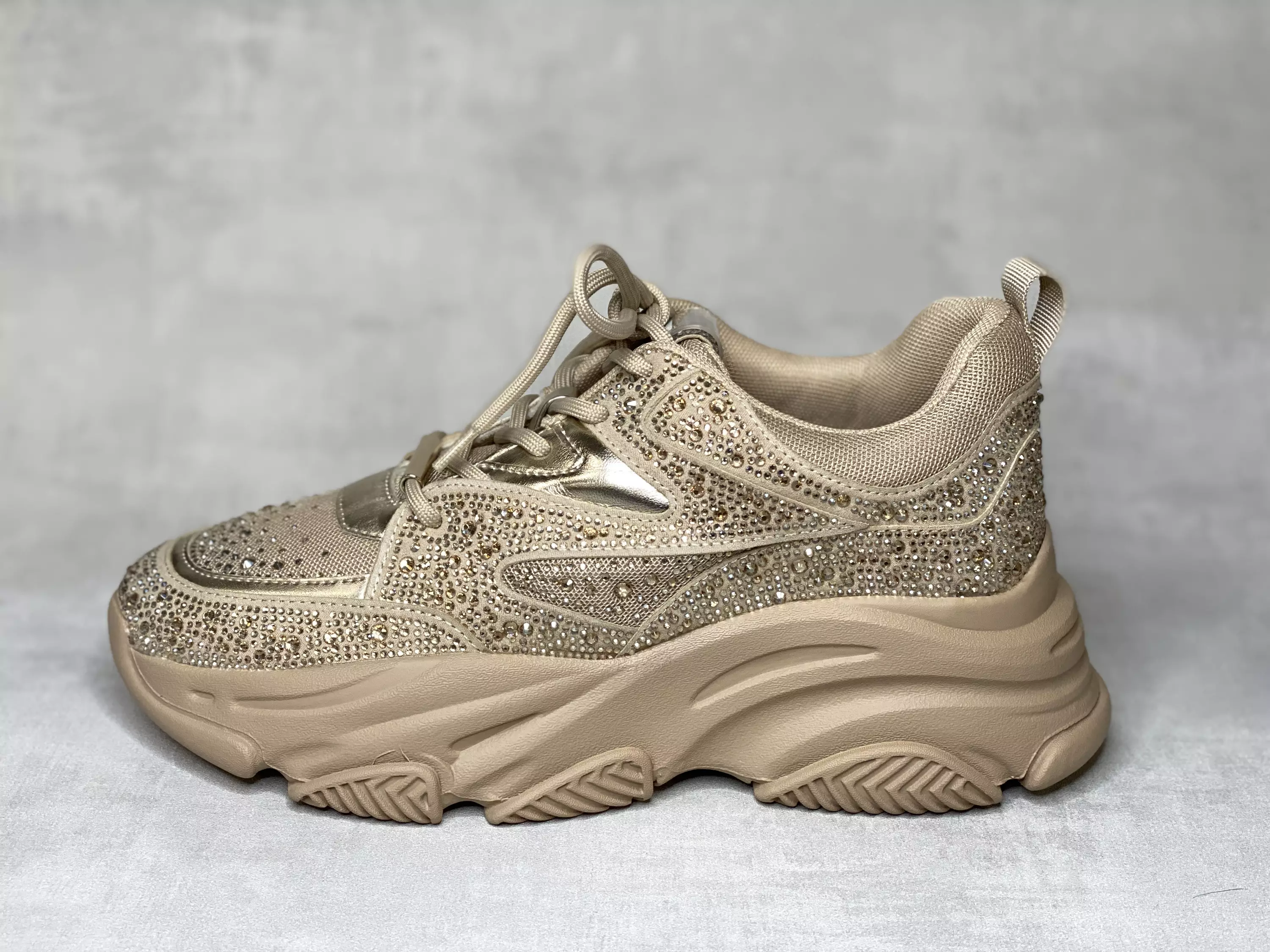 Beiget upeasti kimaltavat Steve Madden Privy lenkkarit! Näyttävästi muotoiltu beige ulkopohja, kengän pinnassa puolestaan lyömätön leikkausten ja strassien kimalluksen liitto! Käännä katseet, erotu joukosta ja kirmaa kesään kimaltavat kengät jalassa! Vaihdettavien pohjallisten ansiosta voit tarvittaessa vaihtaa näihin lenkkareihin omiin jalkoihisi parhaiten istuvat pohjalliset.