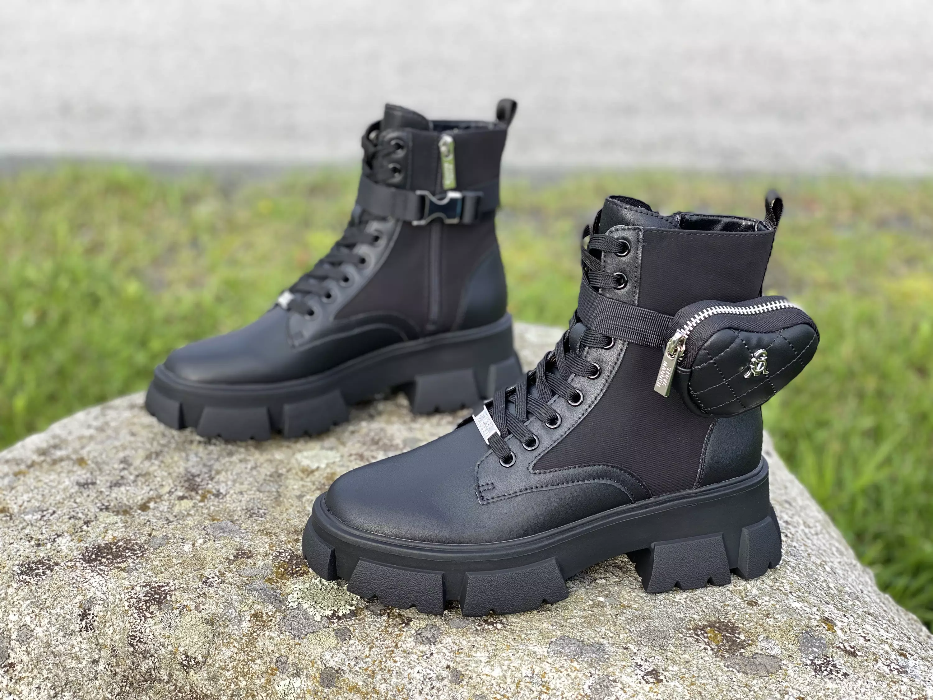 Mustat Steve Madden Tanker-H maiharit. Maihareiden varressa oleva sydäntä muistuttava varsitasku aukeaa vetoketjulla ja on remissään kiinni nepparilla, joten voit käyttää maihareita joko taskulla tai ilman. Taskun tekstiiliremmin pituutta pystyy säätämään ja halutessasi koko remmin voi irrottaa. Pisimmillään remmi on noin 28cm pitkä. Sisäsyrjälle sijoitettu vetoketju helpottaa pukemista. Vetoketjun vedin on metallia ja se on koristettu Steve Madden tekstillä. Nauhojen avulla maiharit on helppo kiristää omaan jalkaan sopiviksi. Nauhoissa keskellä edessä metallinen Steve Madden merkki. Paksu volyymipohja, kannan korkeus noin 6cm ja pohja edestä noin 3,5cm.