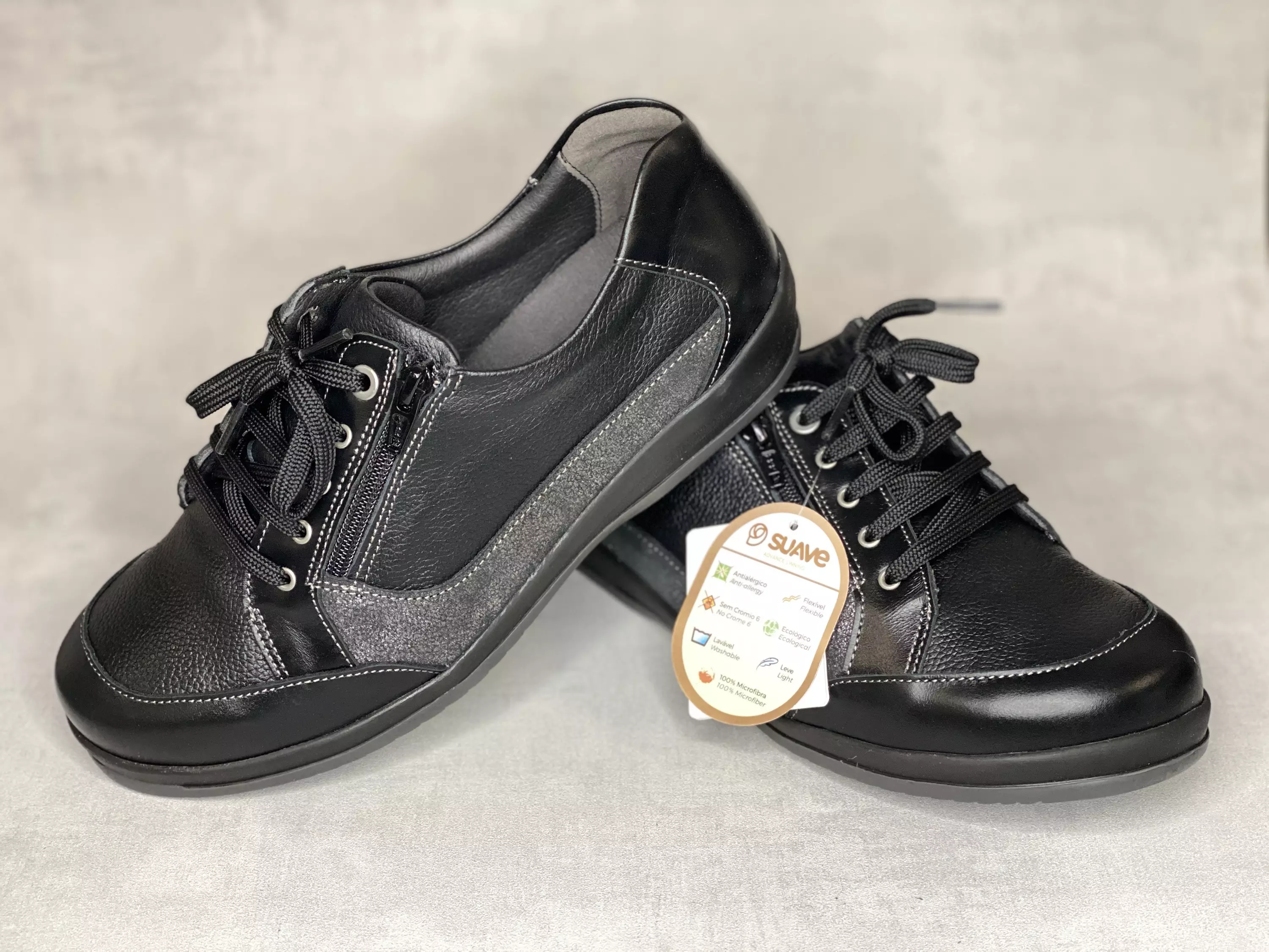 Mustat leveäslestiset Suave Bristol kävelykengät. Pääväriltään mustat kengät ovat saaneet sisä- ja ulkiosyrjälle hopeisenkiiltävät raidat. Nahkaiset kävelykengät nauhoilla ja ulkosyrjälle sijoitetulla pukemista helpottavalla vetoketjulla. Pehmeä pohjallinen, jonka tilalle vaihdat tarvittaessa omaan jalkaasi parhaiten sopivat pohjalliset. Kiilakannan korkeus noin 3cm, edestä noin 1,5cm.