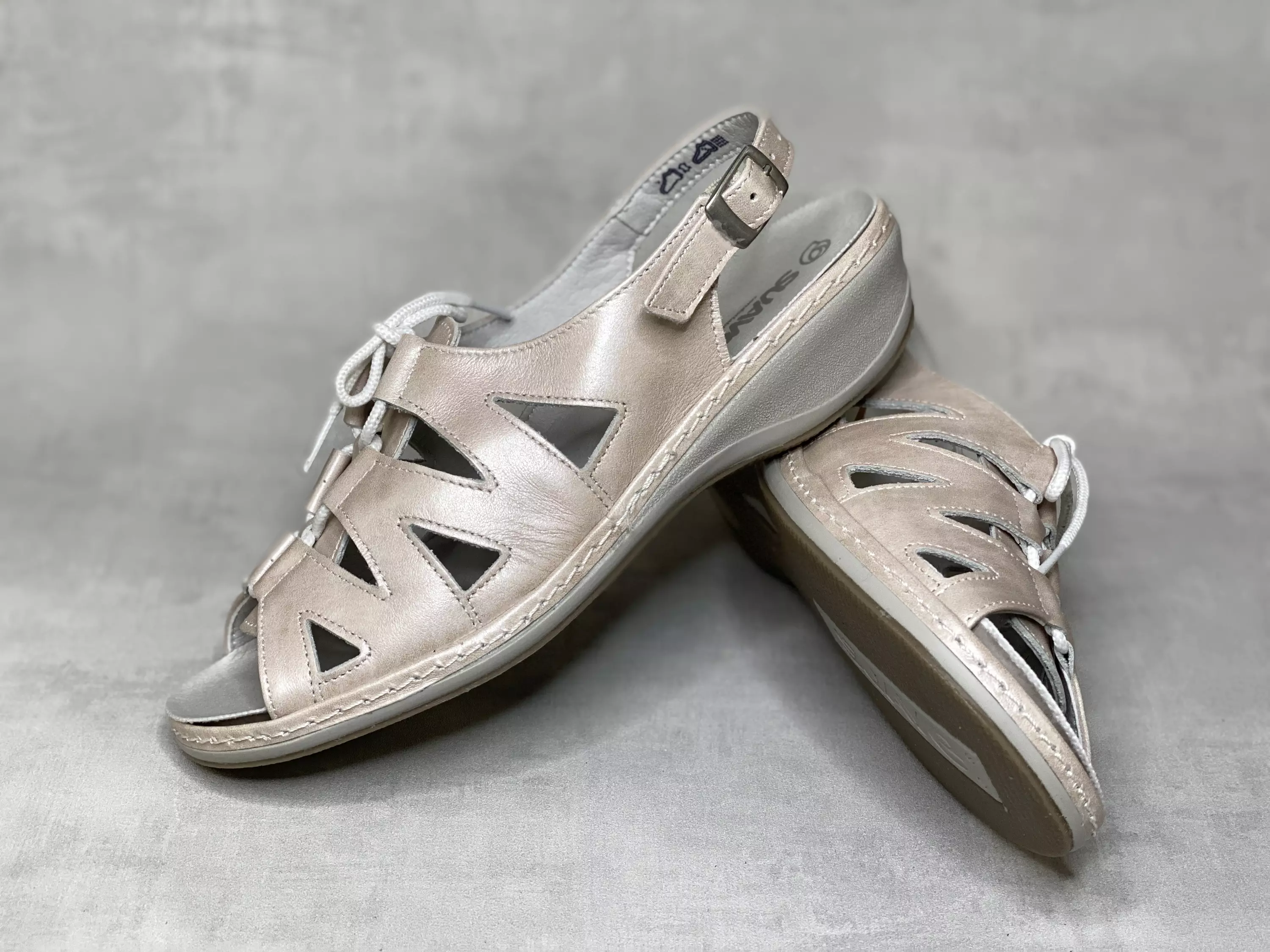 Beiget kevyesti helmiäisenhohtoiset Suave Paris sandaalit. Nauhalla sopivaksi säädettävät sandaalit, joissa solkisäätöinen kantaremmi. Vaihdettavat pohjalliset.