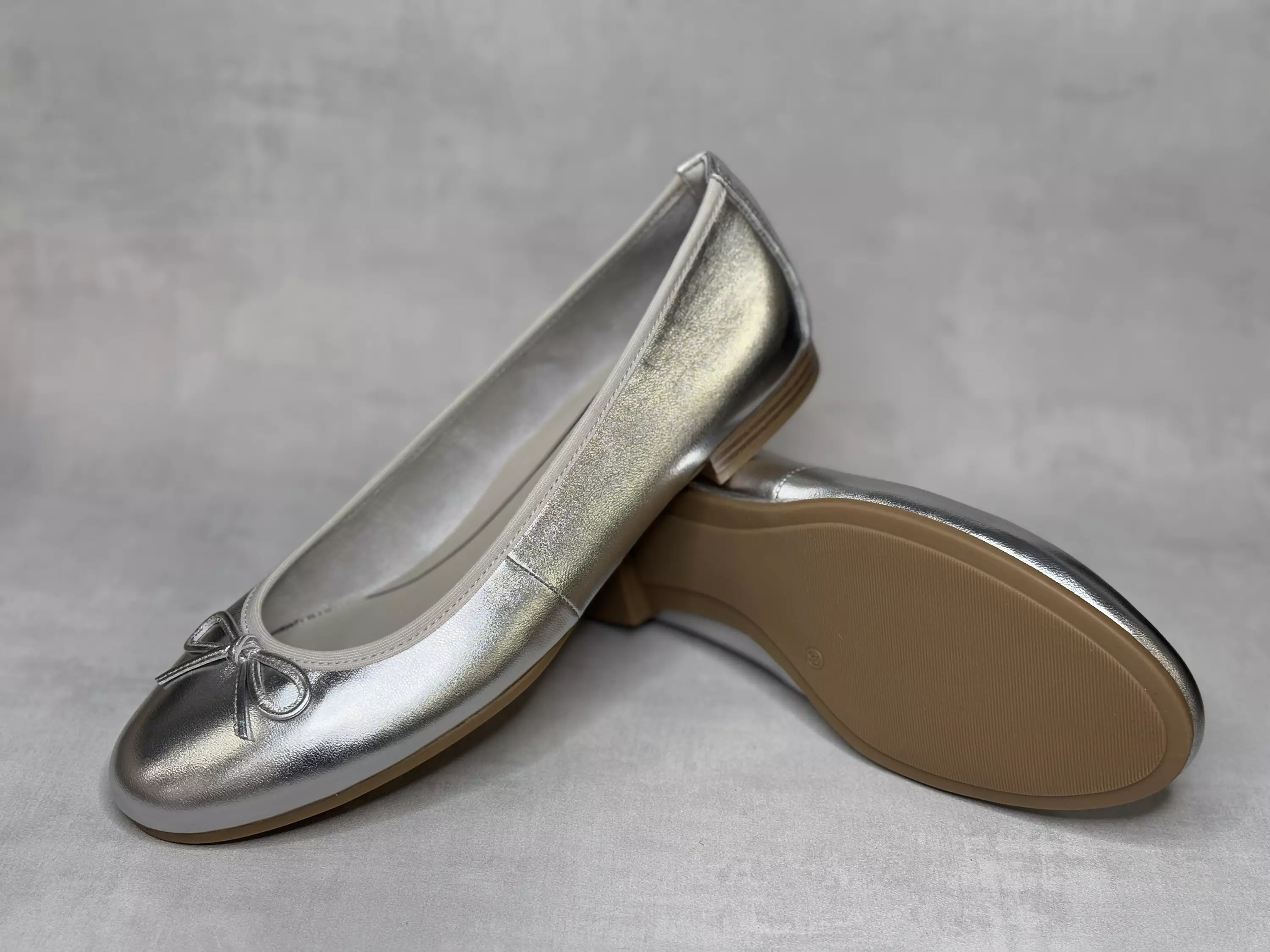 Hopeiset Tamaris ballerinat. Klassiset nahkaiset ballerinat. Kärjessä sievä koristerusetti. Kengänsuussa hieman joustava tekstiilitere, jonka ansiosta kenkä istuu mukavan napakasti jalkaan. Kannan korkeus noin 1,5cm ja pohjan korkeus päkiän alta noin 0,5cm.