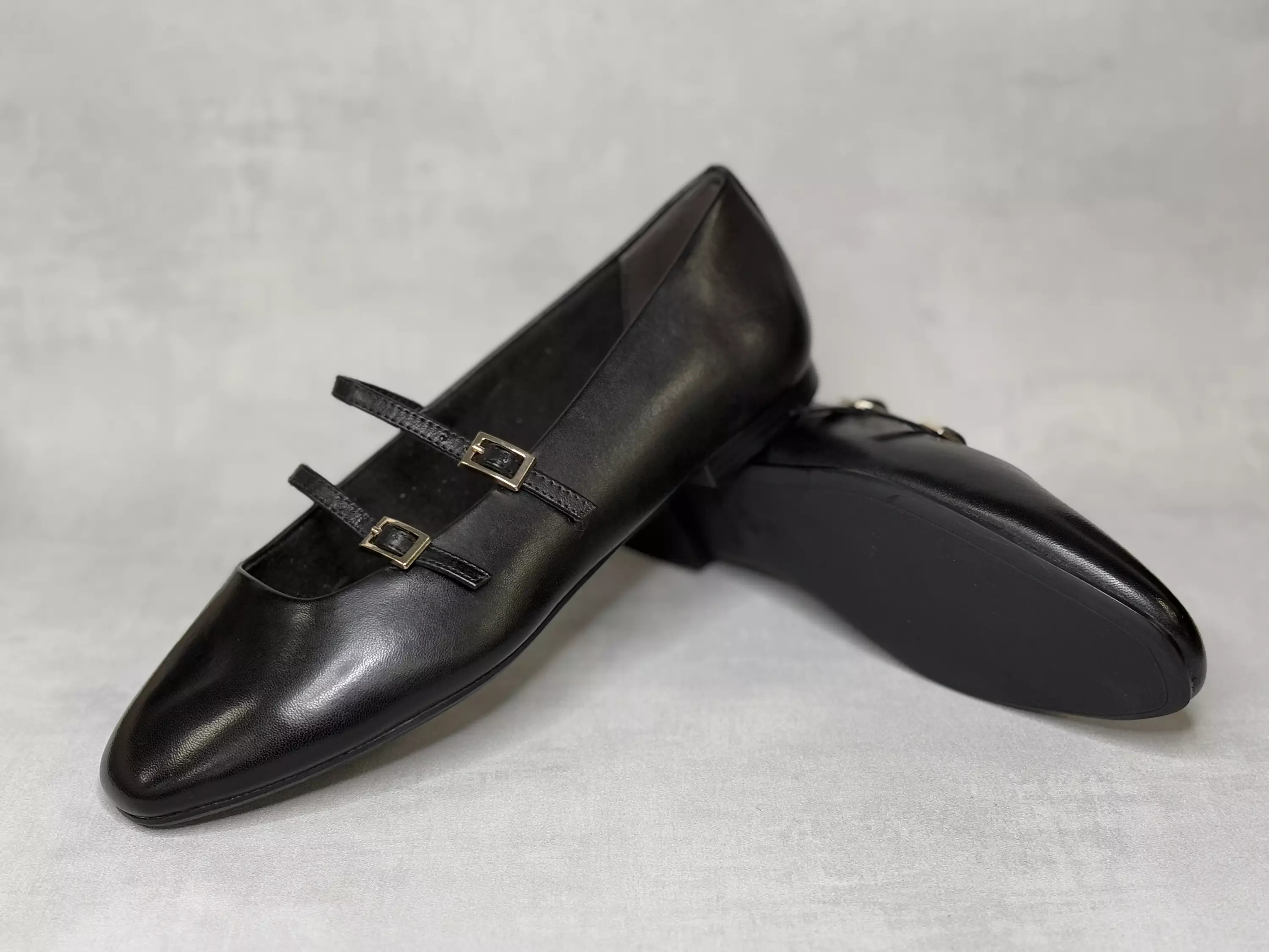 Mustat Tamaris ballerinat. Kahdella soljellisella remmillä varustetut nahkaiset ballerinat. Solkien alla pienet istuvuutta parantavat venykkeet. Kannan korkeus noin 1cm ja pohjan korkeus päkiän alta noin 0,5cm.