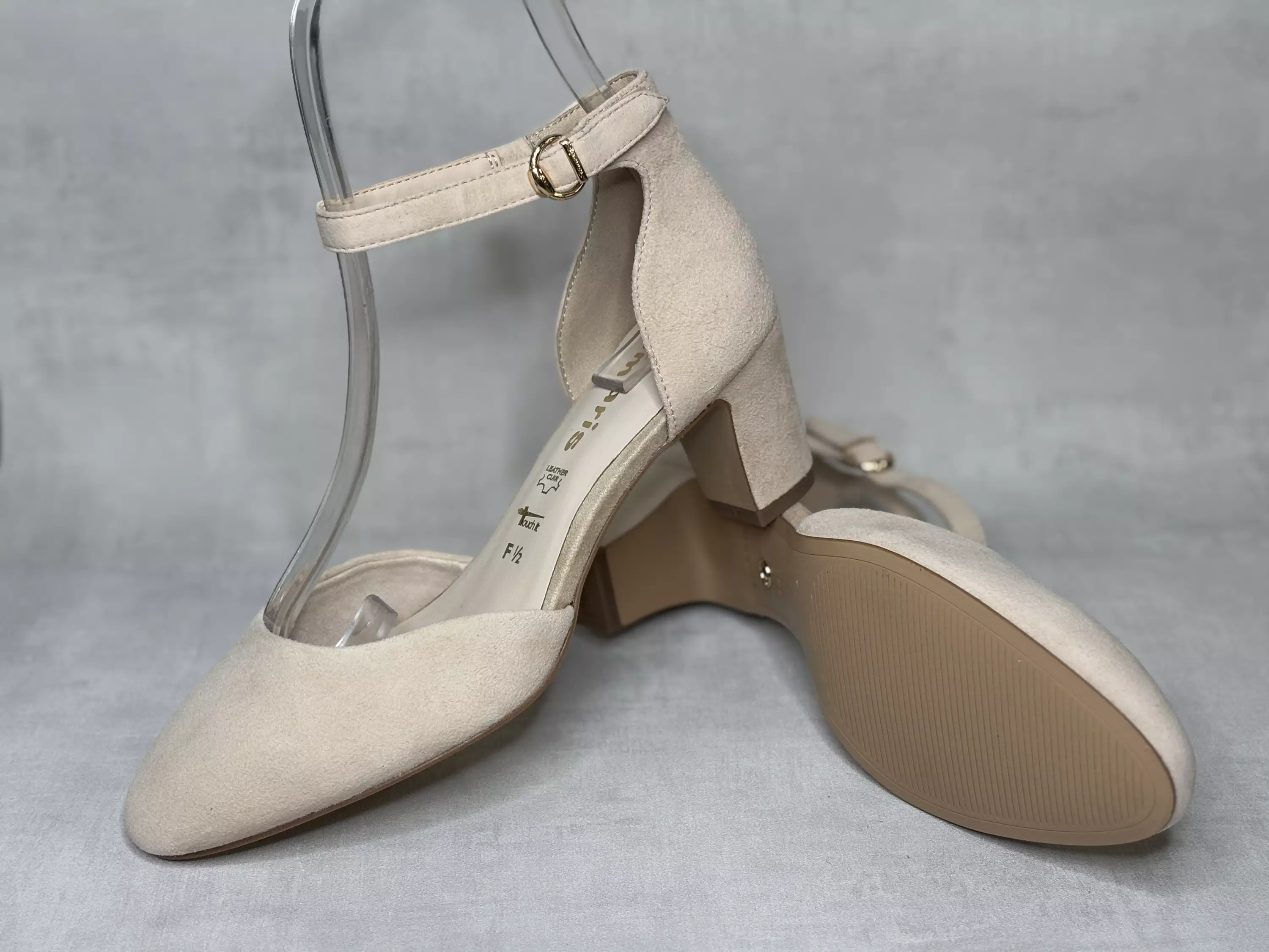 Nudet Tamaris korkokengät. Mokkanahkaiset, nilkkaremmilliset korkokengät. Nilkkaremmissä metallilenkin läpi kulkeva tarrakiinnitys, remmin sisäsyrjällä pieni istuvuutta parantava venyke. Pehmustettu nahkapintainen sisäpohja ja tekstiilinen vuori. Kannan korkeus noin 6,5cm, pohjan korkeus päkiän alta noin 0,5cm.