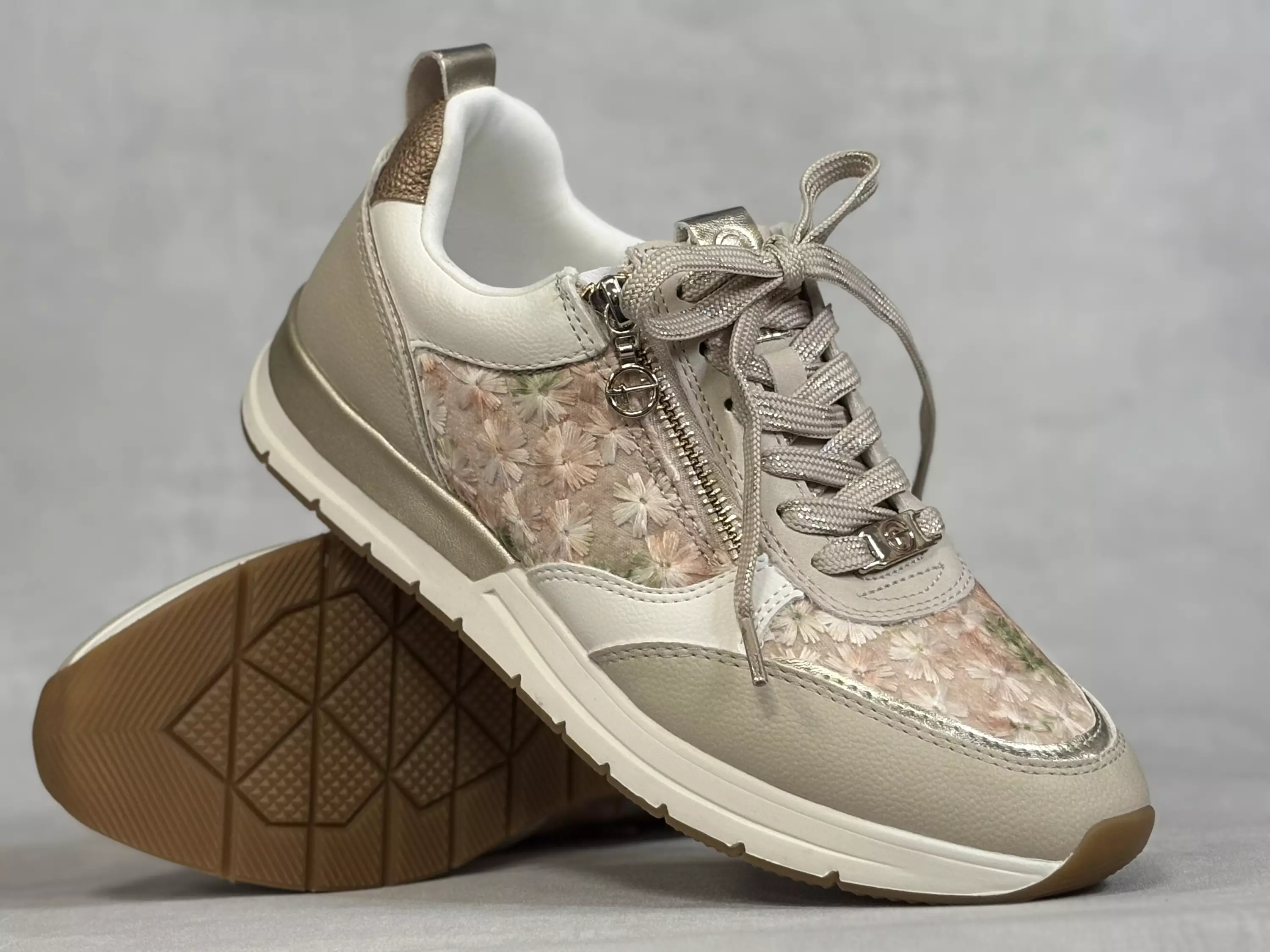 Beiget Tamaris Beige Struct. kävelykengät. Hempeillä kukkakuvioilla koristellut kävelykengät. Aksenttivärinä kantakappaleessa myös hitunen pronssia. Nauhojen avulla kengät on helppo säätää omaan jalkaan sopiviksi ja ulkosyrjälle sijoitetutn vetoketjun avulla kengät on helppo pukea. Kevyesti muotoillu pehmeät pohjalliset ovat vaihdettavat, joten tarvittaessa sujautat kenkiin omia tarpeitasi parhaiten palvelevat pohjalliset. Lestimitoitus normaali G. Kannan korkeus noin 3cm ja pohjan korkeus päkiän alta noin 2cm.