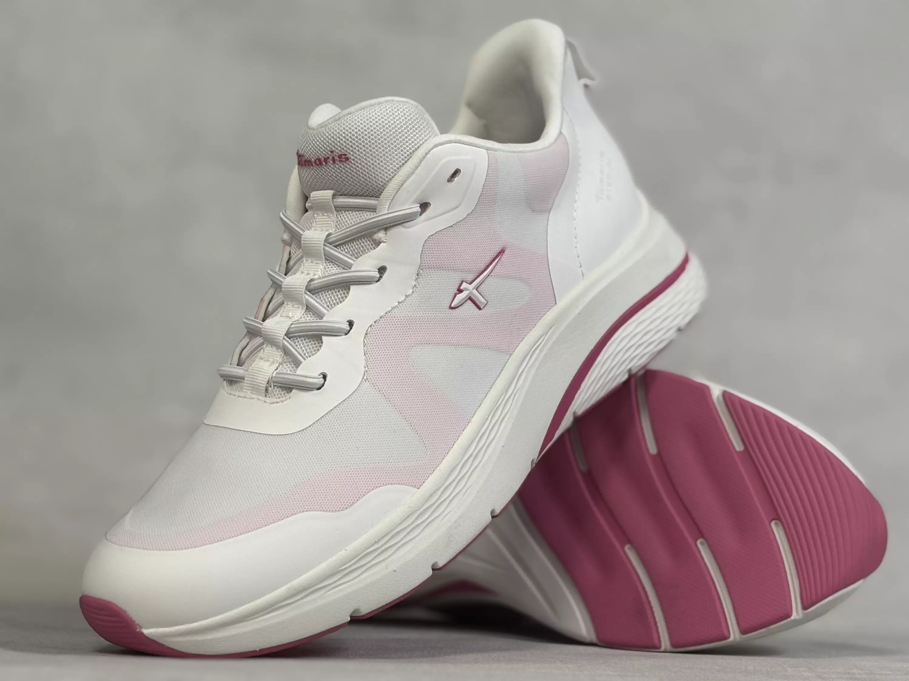 Valkoiset Tamaris Comfort kävelykengät. Aksenttivärinä vaaleanpunaista ja fuksianpunaista. Step-in kenkälusikkakannan avulla kengät on helppo pukea. Joustavat venykenauhat (nauhat eivät ole säädettävissä!). Vaihdetavissa pohjallisissa on kevyt holvikaarentuki. Tarvittaessa sujautat kenkiin omia arpeitasi parhaiten vastaavat pohjalliset. Lestimitoitus leveähkö H-lesti. Kannan korkeus noin 4cm ja pohjan korkeus päkiän alta noin 2cm.
