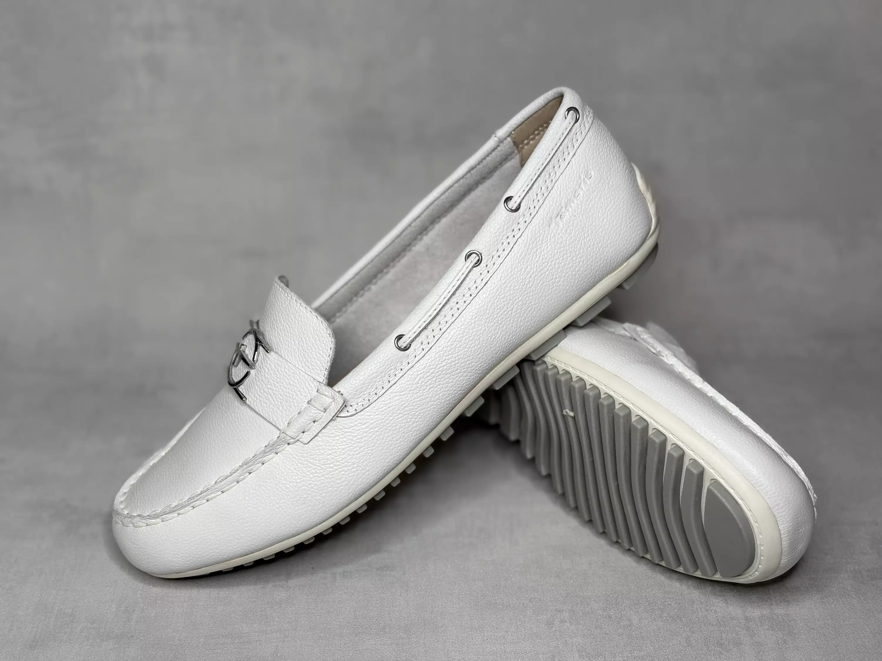 Valkoiset Tamaris loaferit. Mukavan pehmeät nahkaiset kävelykengät. Mokkasiinimallinen kärki. Koristeremmissä hopean värinen somiste. Purjehduskengistä tuttuun tyyliin kengänsuuta kiertää koristenauha. Vaihdettavat pohjalliset, joiden tilalle sujautat tarvittaessa omia tarpeitasi parhaiten vastaavat pohjalliset. Kannan korkeus noin 1,5cm pohjan korkeus päkiän alta noin 1cm.