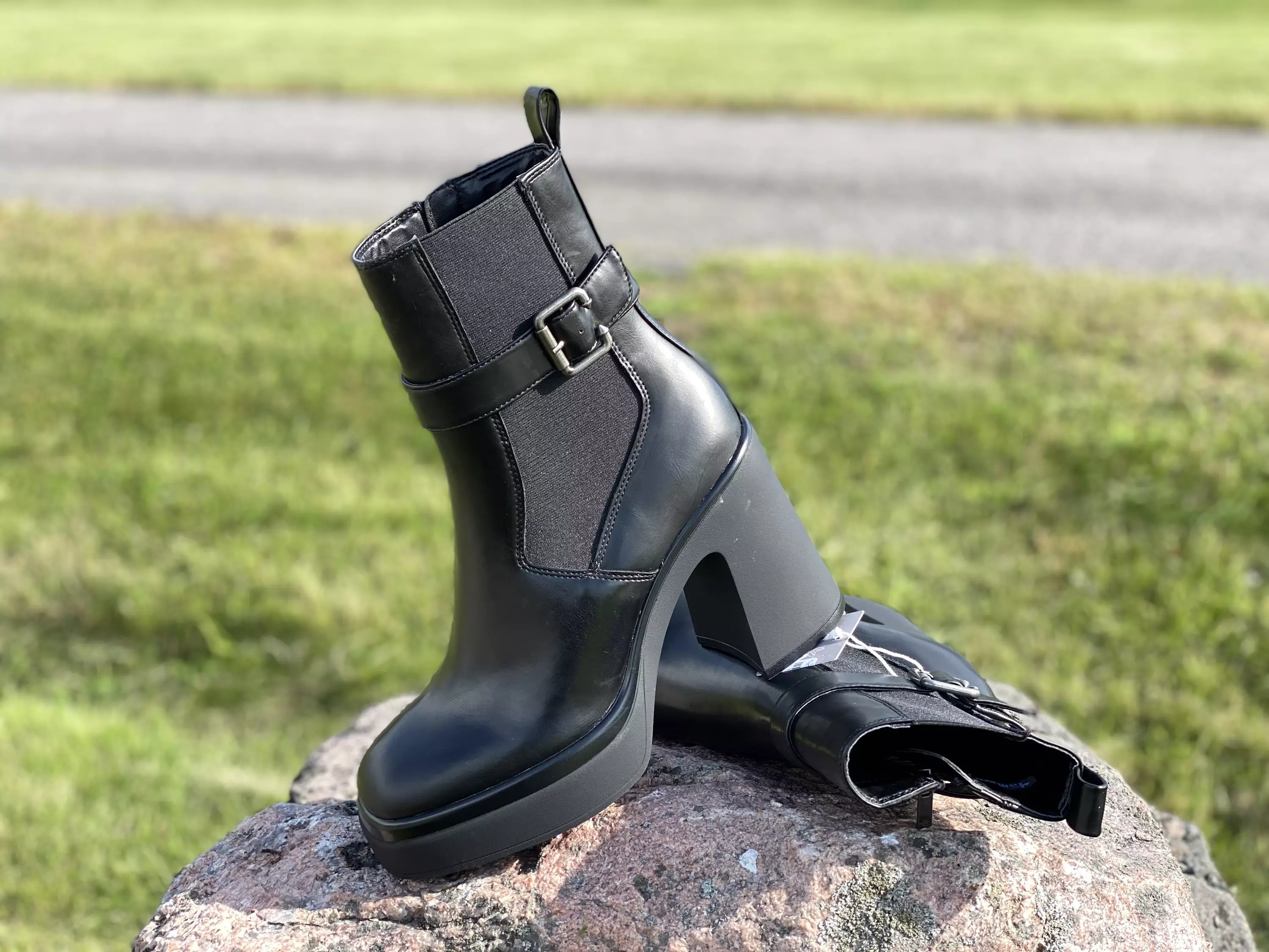 Mustat Tamaris nilkkurit. Paksulla pohjalla ja upeasti muotoillulla korolla varustetut nilkkurit, joissa ulkosyrjällä istuvuutta parantava venyke ja soljellinen koristeremmi. Nilkkureiden kannassa vetolenkki ja sisäsyrjällä pukemista helpottava vetoketju.