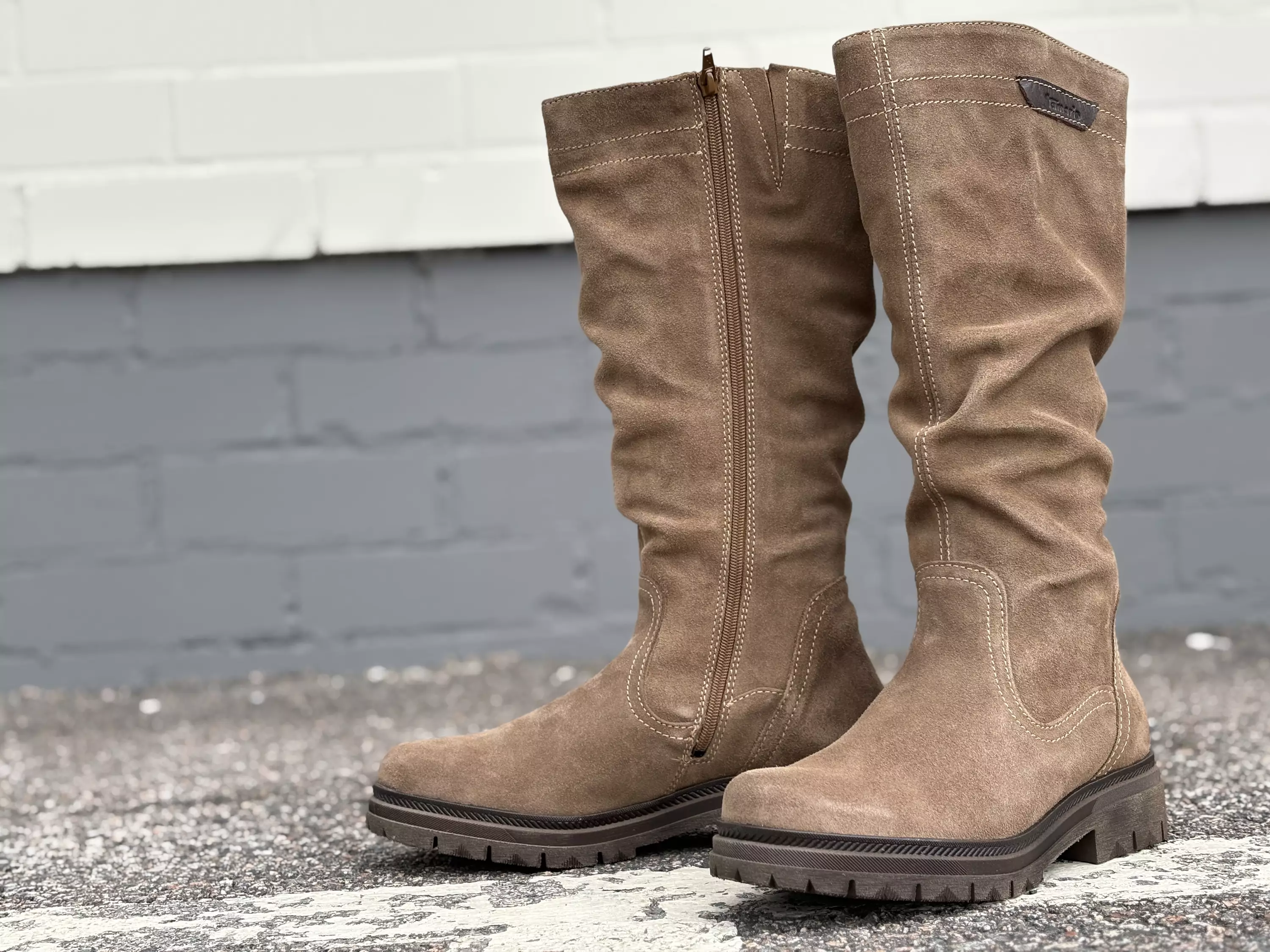 Ruskeat Tamaris nahkasaappaat. Mokkanahkaiset saappaat, joiden varressa tyylikäs rypytys. Ulkosyrjällä tummaruskea nahkamerkki, jossa Tamaris-logo. Tekstiilinen vuori. Varren sisäsyrjällä pukemista vauhdittava vetoketju sekä kenkien istuvuutta parantava venyke. Lestimitoitus normaali G-lesti. Kannan korkeus noin 4cm ja pohjan korkeus päkiän alta noin 2cm.