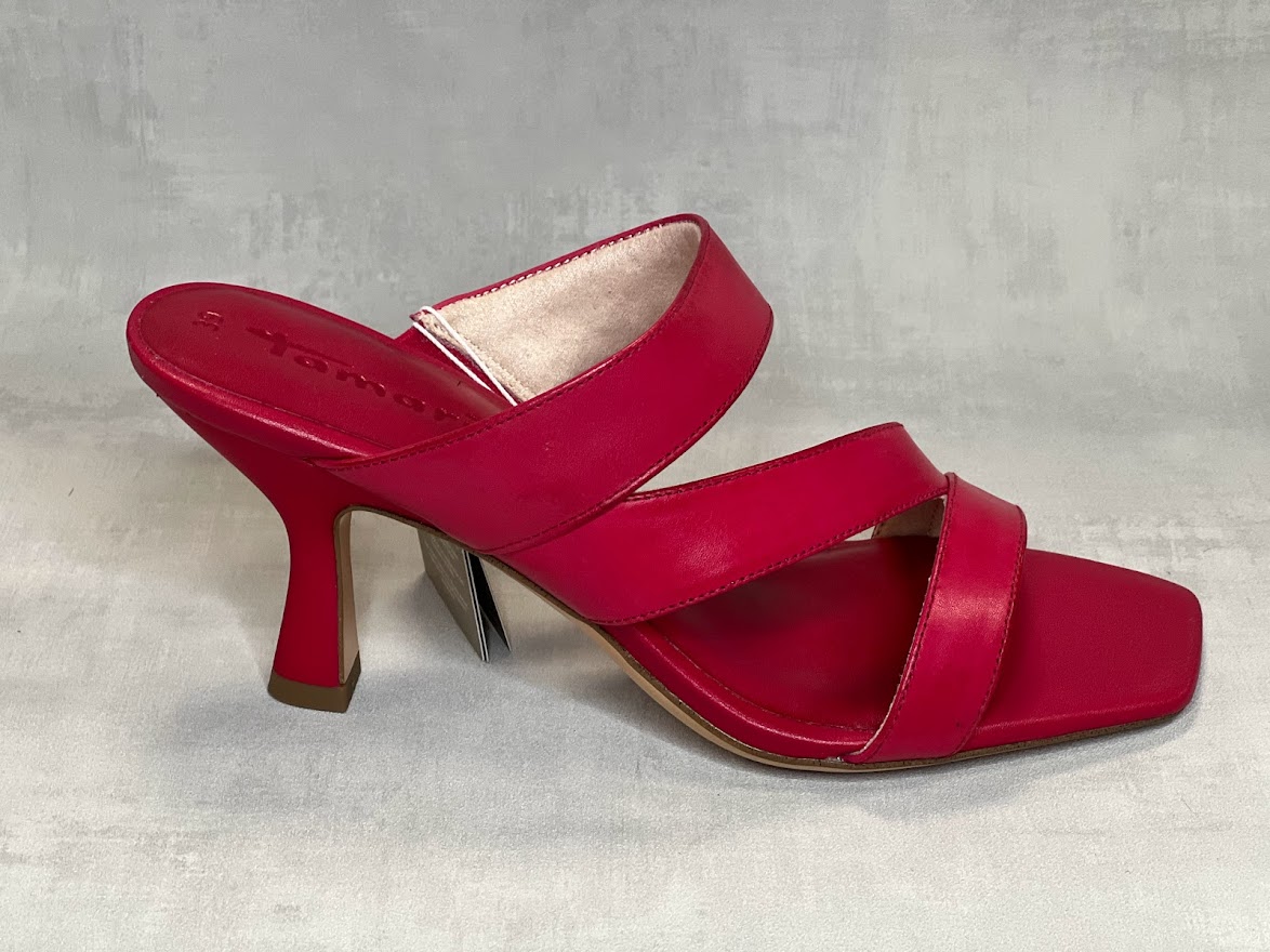 Fuksianpunaiset Tamaris nahkasandaalit upealla erikoisella korolla ja tyylikkäällä neliskanttisella kärjellä. Tekstiilinen sisävuori tuntuu mukavalta jalkaa vasten. Ylimmän remmin sisäsyrjällä pieni venyke, joka parantaa kengän istuvuutta ja lisää käyttömukavuutta.