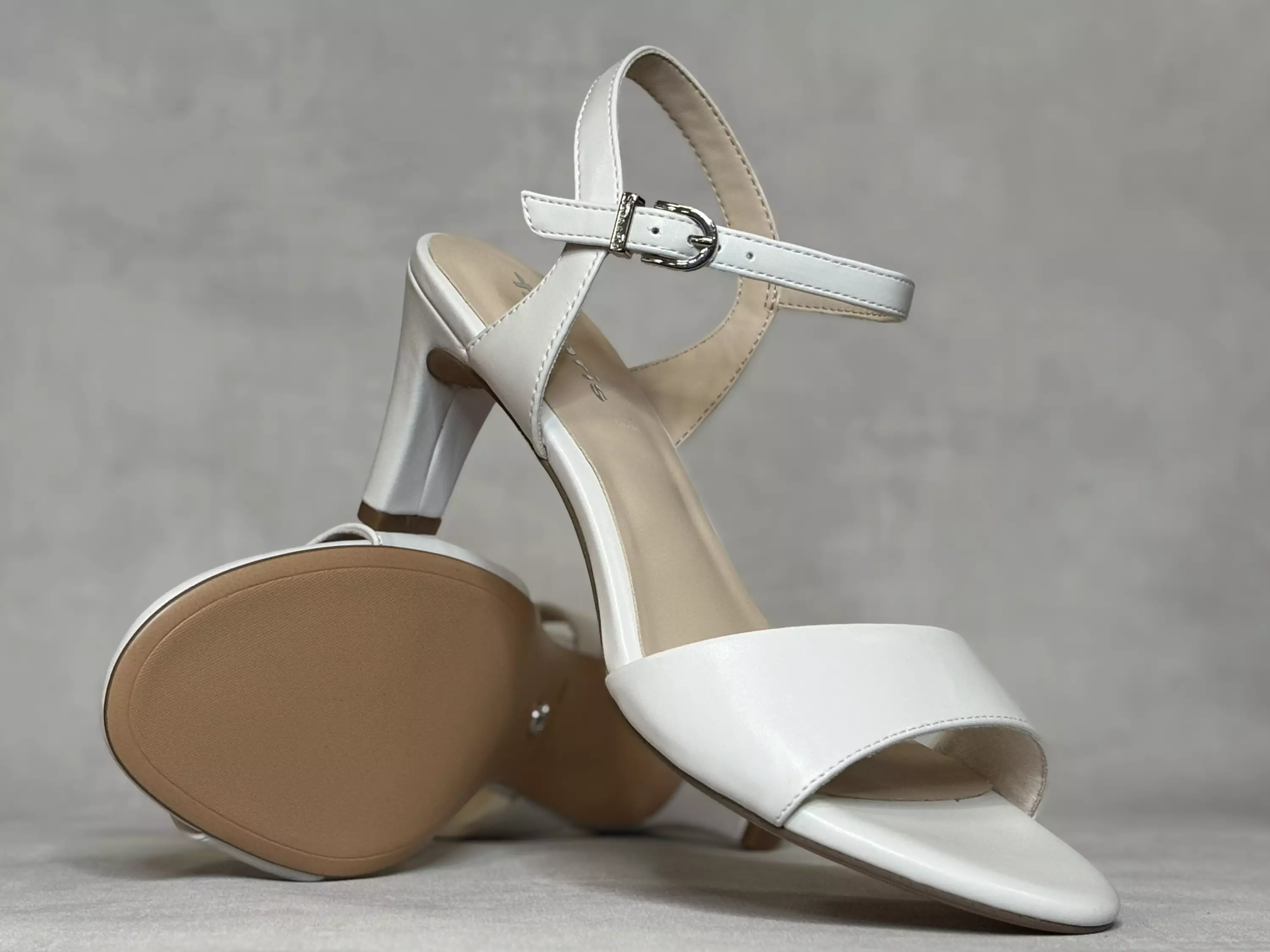 Valkoiset Tamaris sandaalit. Korolliset mattavalkoiset sandaalit on varustettu nilkkaremmillä, jossa on hopeanvärinen solki. Hillitty sandaali on tyylikäs valinta häihin ja muihin juhlatilaisuuksiin. Mainiot myös muihin kesärientoihin!