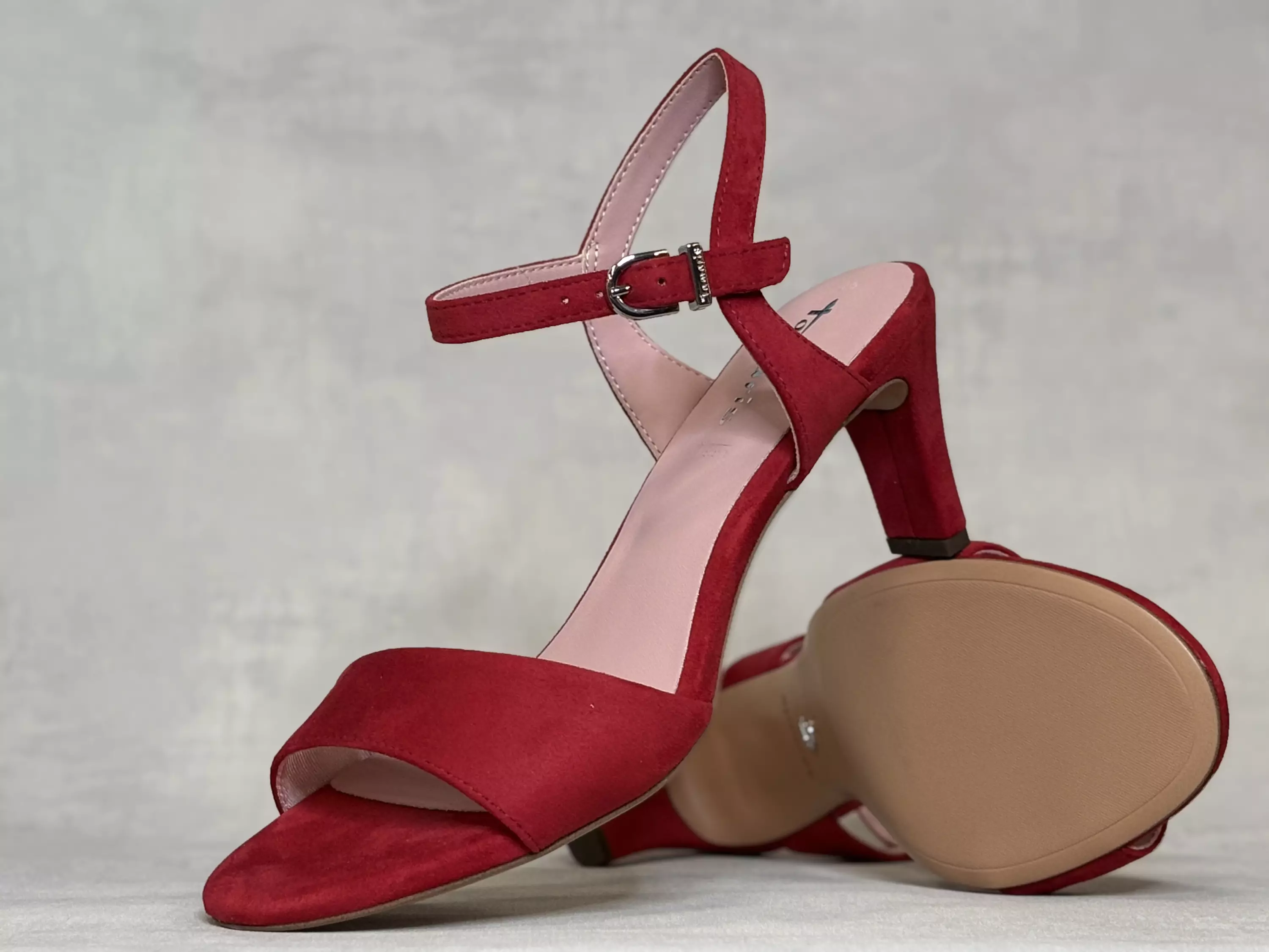Punaiset Tamariksen korolliset sandaalit. Korolliset remmisandaalit on varustettu nilkkaremmillä, jossa on metallinen solki. Soljessa on myös venyke istuvuuden takaamiseksi. Vähäeleinen ja hillitty sandaali sopii mainiosti niin mekon, hameen kuin housujenkin pariksi. Kannan korkeus 7,0cm, pohjan korkeus päkiän alta noin 1cm.