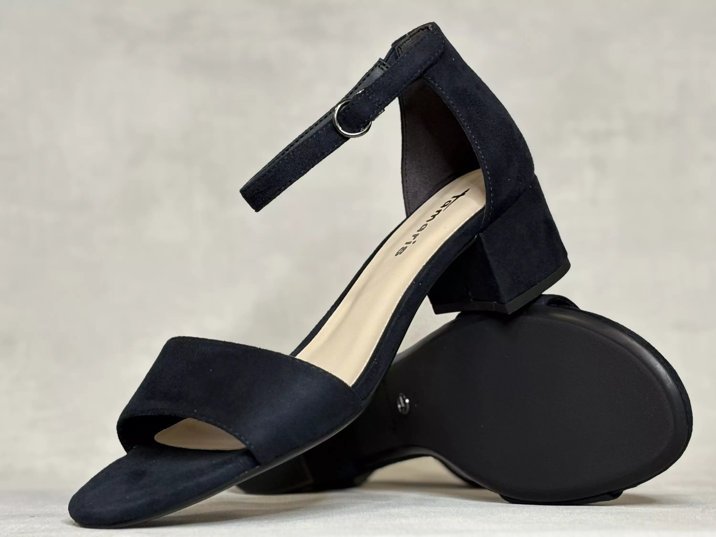 Navy-siniset Tamariksen korolliset sandaalit. Matalakorkoiset sandaalit on varustettu tarrasäätöisellä nilkkaremmillä, jossa on tumma metallinen koristesolki. Vähäeleinen ja hillitty sandaali sopii mainiosti niin mekon, hameen kuin housujenkin pariksi. Kannan korkeus 4,5cm, pohjan korkeus päkiän alta noin 1cm.
