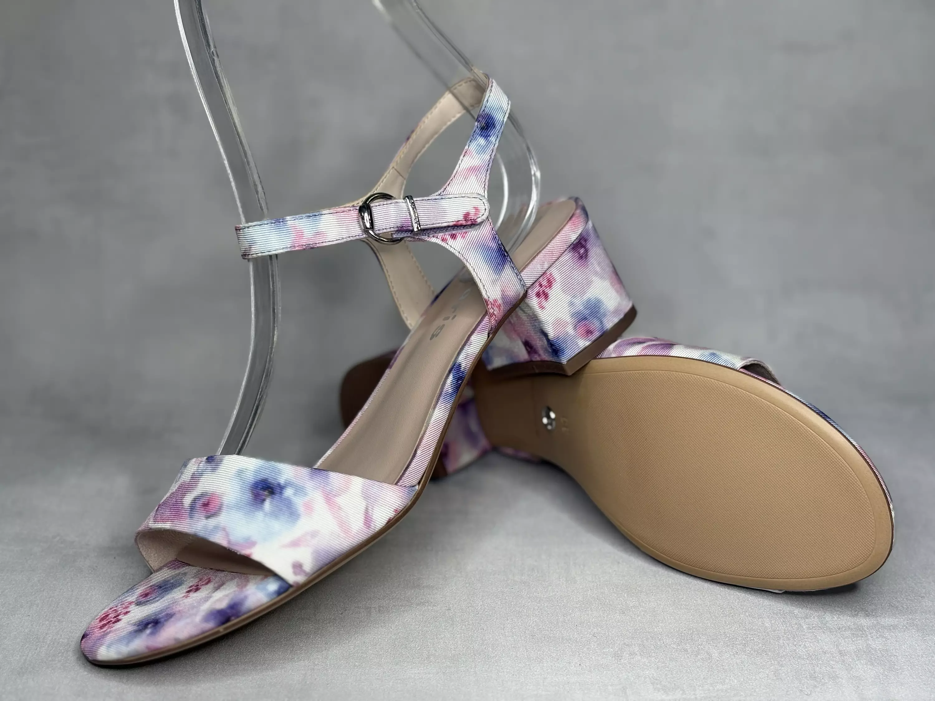 Laventelin lilat Tamaris sandaalit. Matalakorkoiset kukkakuvioiset nilkkaremmilliset sandaalit. Kukkakuvioissa vaihtelevat pastellisävyiset lilat, vaaleanpunaiset ja siniset kukkakuviot. Jokainen kenkä on ulkonäöltään uniikki, joten huomaathan, ettei vastaanottamasi kenkäpari ole identtinen verkkokauppakuvien kenkien kanssa. Tarrasäätöisessä nilkkaremmissä on metallinen koristesolki. Kannan korkeus noin 5cm ja pohjan korkeus päkiän alta noin 1cm.Vegaaniset.