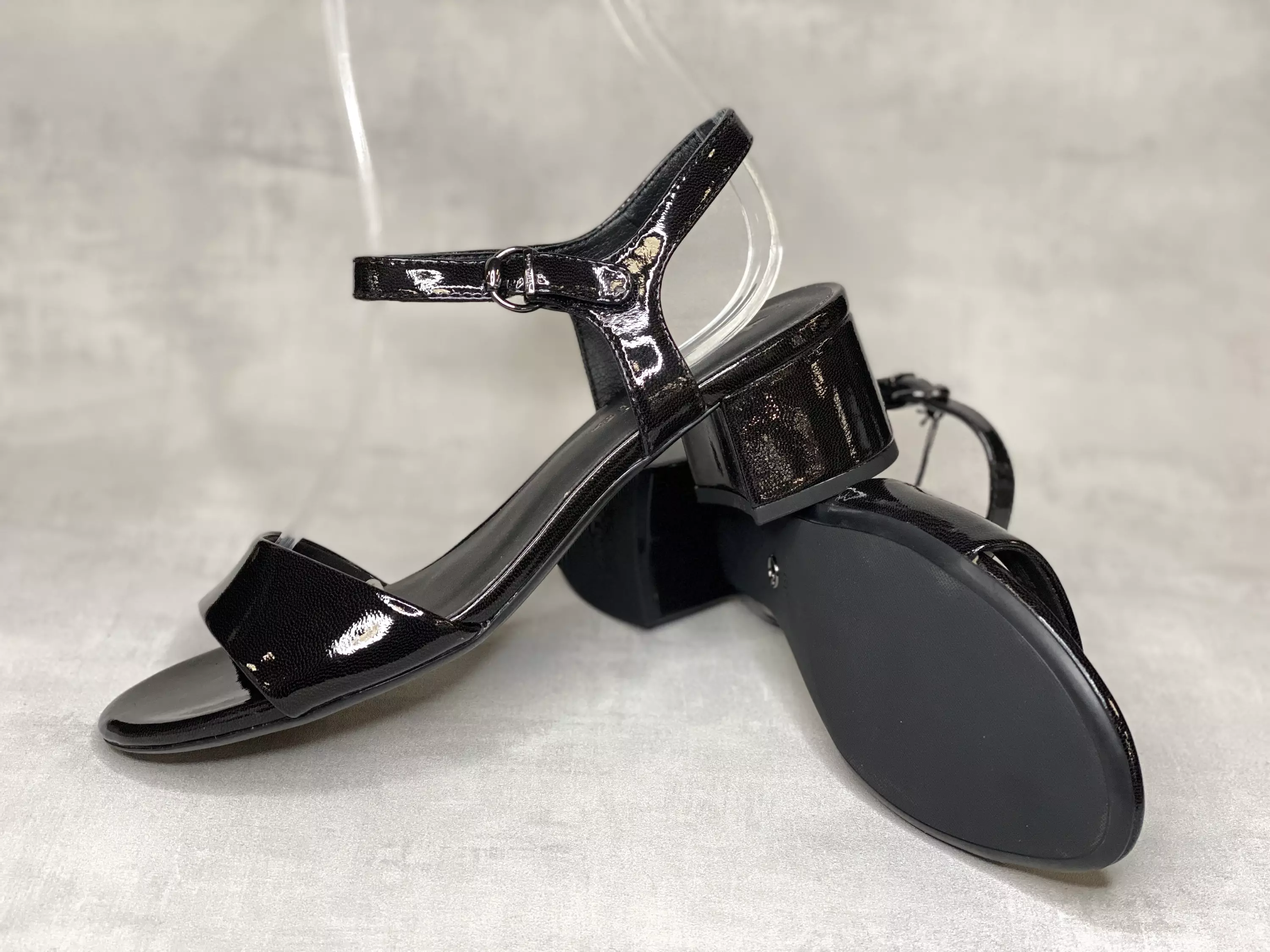 Mustat Tamaris sandaalit. Matalakorkoiset nilkkaremmilliset sandaalit. Tarrasäätöisessä nilkkaremmissä on metallinen koristesolki. Kannan korkeus noin 5cm ja pohjan korkeus päkiän alta noin 1cm.