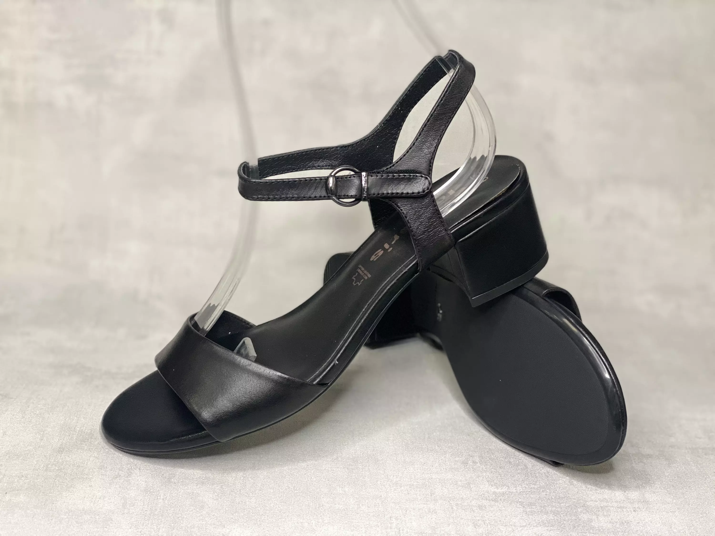 Mustat Tamaris sandaalit. Matalakorkoiset nahkasandaalit on varustettu tarrasäätöisellä nilkkaremmillä, jossa on tumman metallin värinen koristesolki. Vähäeleinen ja hillitty sandaali sopii mainiosti niin mekon, hameen kuin housujenkin pariksi. Kannan korkeus 4,5cm, pohjan korkeus päkiän alta noin 1cm.