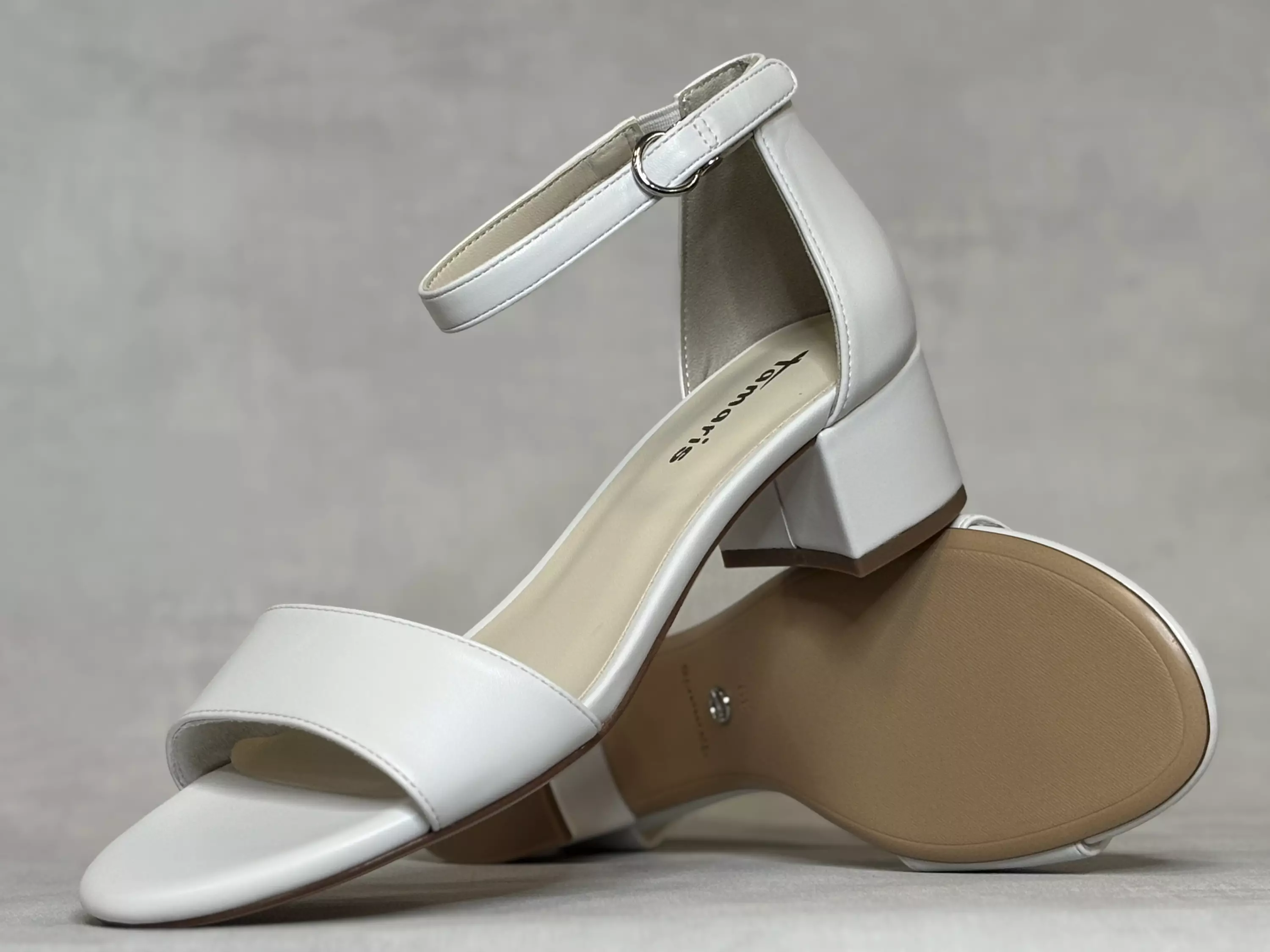 Valkoiset Tamariksen korolliset sandaalit. Matalakorkoiset sandaalit on varustettu tarrasäätöisellä nilkkaremmillä, jossa on metallinen koristesolki. Vähäeleinen ja hillitty sandaali sopii mainiosti niin mekon, hameen kuin housujenkin pariksi. Kannan korkeus 4,5cm, pohjan korkeus päkiän alta noin 1cm.