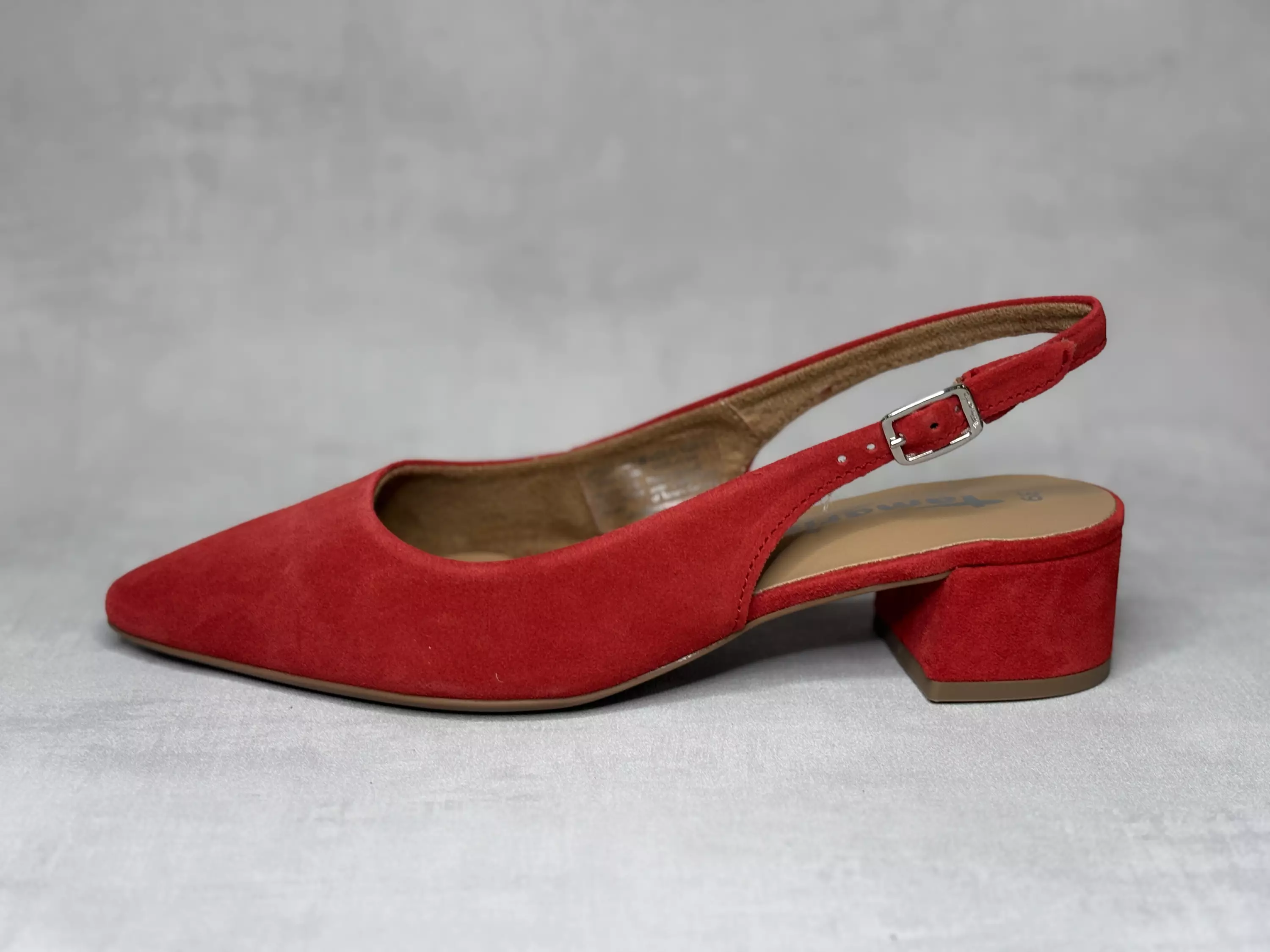 Punaiset Tamaris korkokengät. Matalakorkoiset mokkanahkaiset sling back korkokengät on varustettu tyylikkäällä terävällä kärjellä. Soljella säädettävä kantaremmi. Soljen alla pieni istuvuutta parantava venyke. Kannan korkeus noin 4cm ja pohjan korkeus päkiän alta noin 0,5cm.