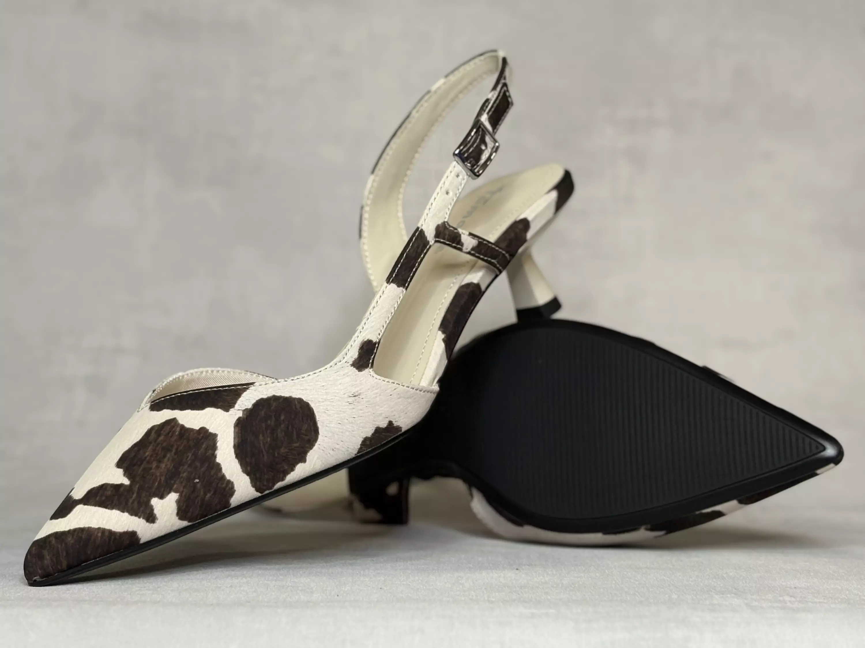 Valkoruskeat Tamaris Cow Sling back avokkaat. Hauskat lehmänlaikkuiset korkokengät matalalla korolla, joka sekin tuo etäisesti mieleen lehmän jalan! Tyylikäs terävä kärki. Eläinkuosit jatkavat muodin huipulla surffaamista tänäkin kesänä. Hopean värisellä säätösoljella varustettu kantaremmi. Lestimitoitus normaali (G). Kannan korkeus noin 5cm ja pohjan korkeus päkiän alta noin 0,5cm.
