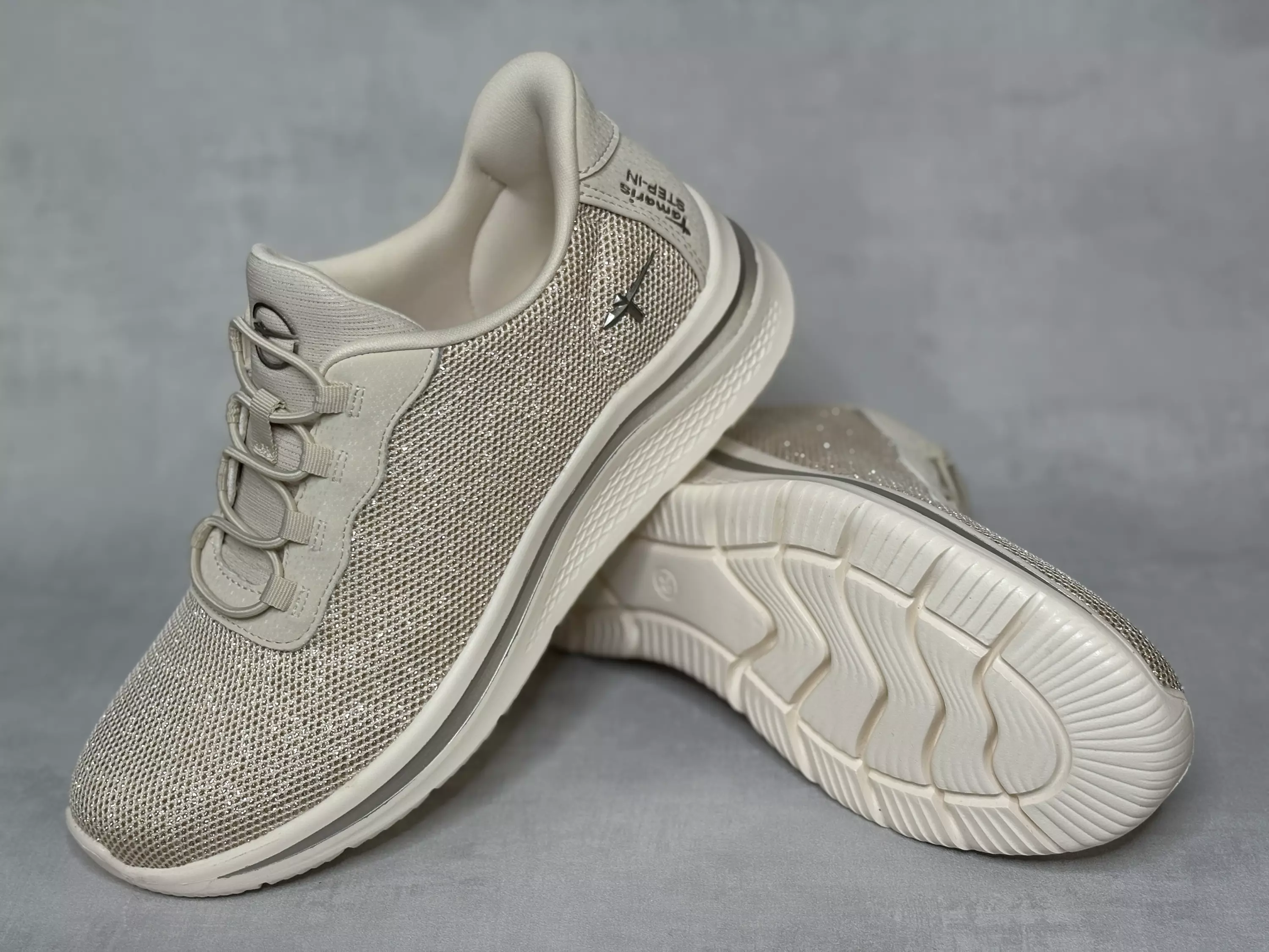 Kermanvalkoiset Tamaris Comfort kävelykengät. Upea kullankimaltava pinta, kermanvalkoinen iltti ja kantakappale, sekä nauhat. Ei mitään irtohileitä vaan suoraan kengän materiaaliin sisällytetty kullankiilto. Step-in kenkälusikkakannalla varustetut tennarit on helppo pukea! Joustavat venykenauhat (eivät ole säädettävissä). Tamaris Comfort-pohjalliset ovat pehmeät ja vaihdettavissa, joten tarvittaessa sujautat kenkiin omia tarpeitasi parhaiten vastaavat pohjalliset. Kannan korkeus noin 3cm ja pohjan korkeus päkiän alta noin 2cm.