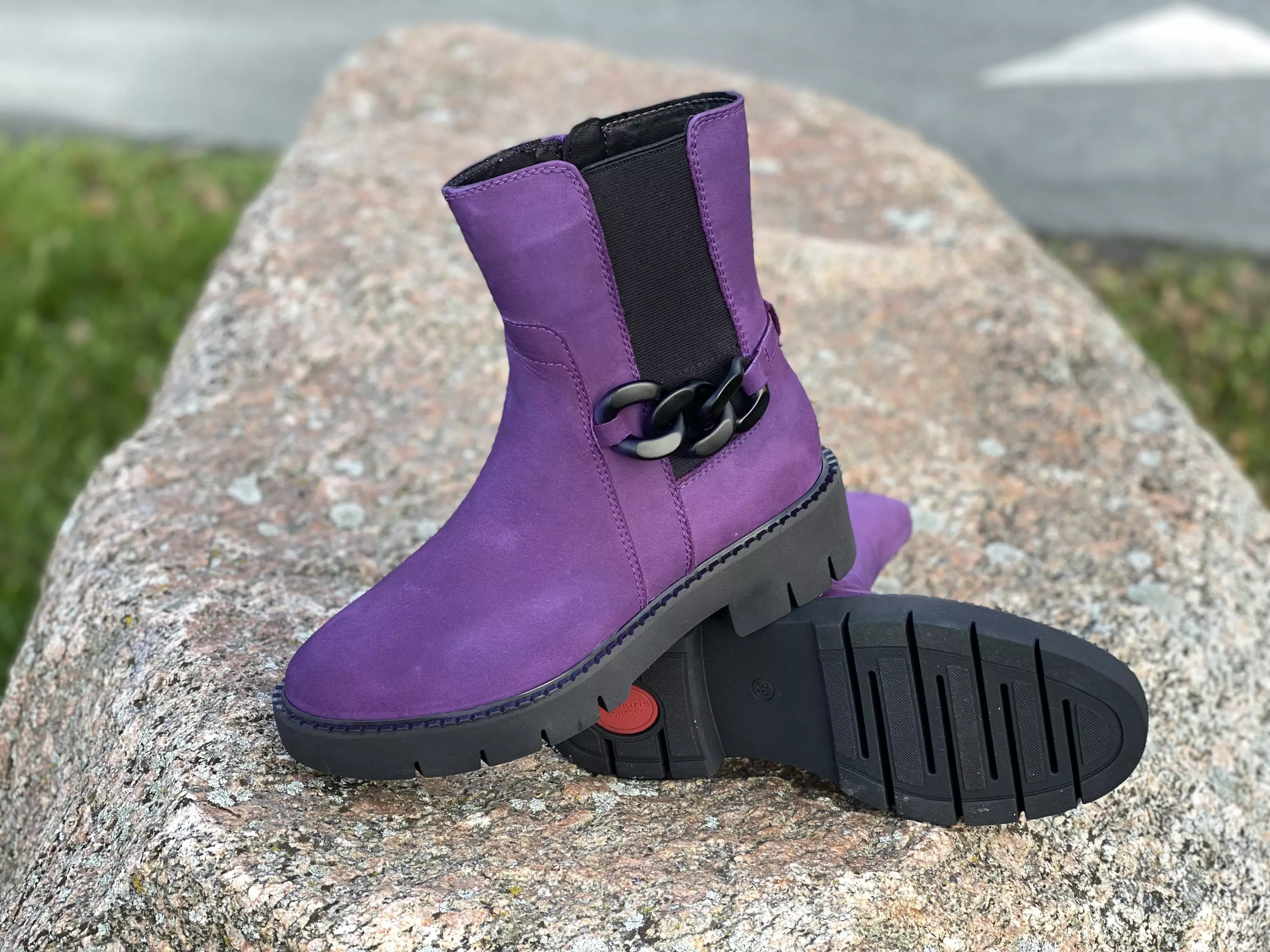 Violetit Tamaris Comfort nilkkurit. Upeat nupukkinahkaiset nilkkurit! Ulkosyrjällä upea kolmilenkkinen koristeketju sekä istuvuutta parantava venyke. Sisäsyrjällä pukemista helpottava vetoketju. Tekstiilipintaiset kevyesti muotoillut pohjalliset, joiden tilalle vaihdat tarvittaessa omia tarpeitasi parhaiten vastaavat pohjalliset.
