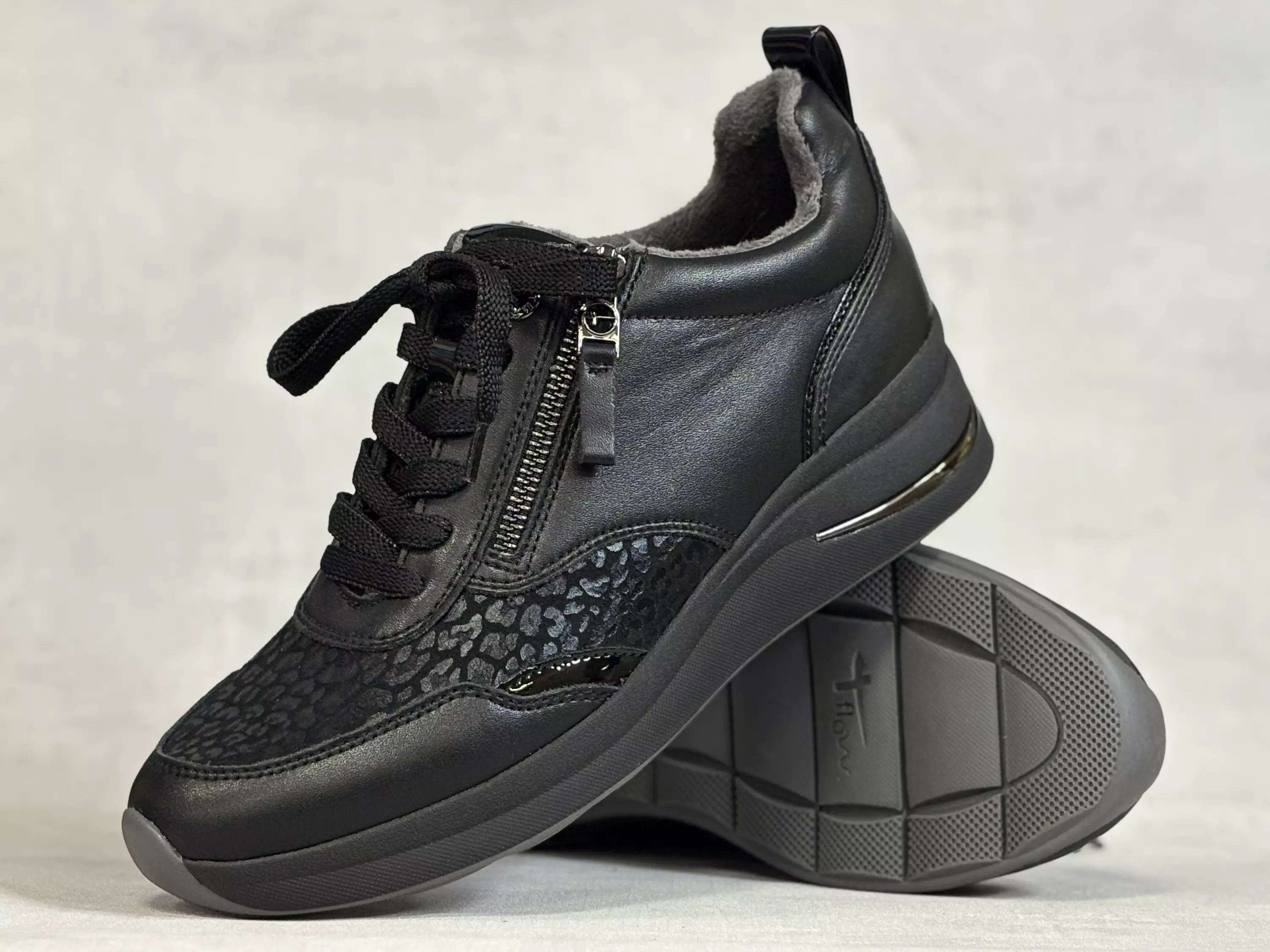 Mustat Tamaris Comfort kävelykengät. Kiilapohjaiset kävelykengät, joiden kärjessä mustaa-mustalla leopardikuvio. Nauhojen avulla kengät on helppo säätää omaan jalkaan sopivan kireälle ja ulkosyrjälle sijoiotettu vetoketju vauhdittaa pukemista. Sisäsyrjällä kenkien istuvuutta parantava venyke. Nahkapintaiset pohjalliset ovat irrotettavat, joten tarvittaessa sujautat kenkiin omia tarpeitasi parhaiten vastaavat pohjalliset. H-lestiset kengät. Kannan korkeus noin 4,5cm ja pohjan korkeus päkiän alta noin 2cm.