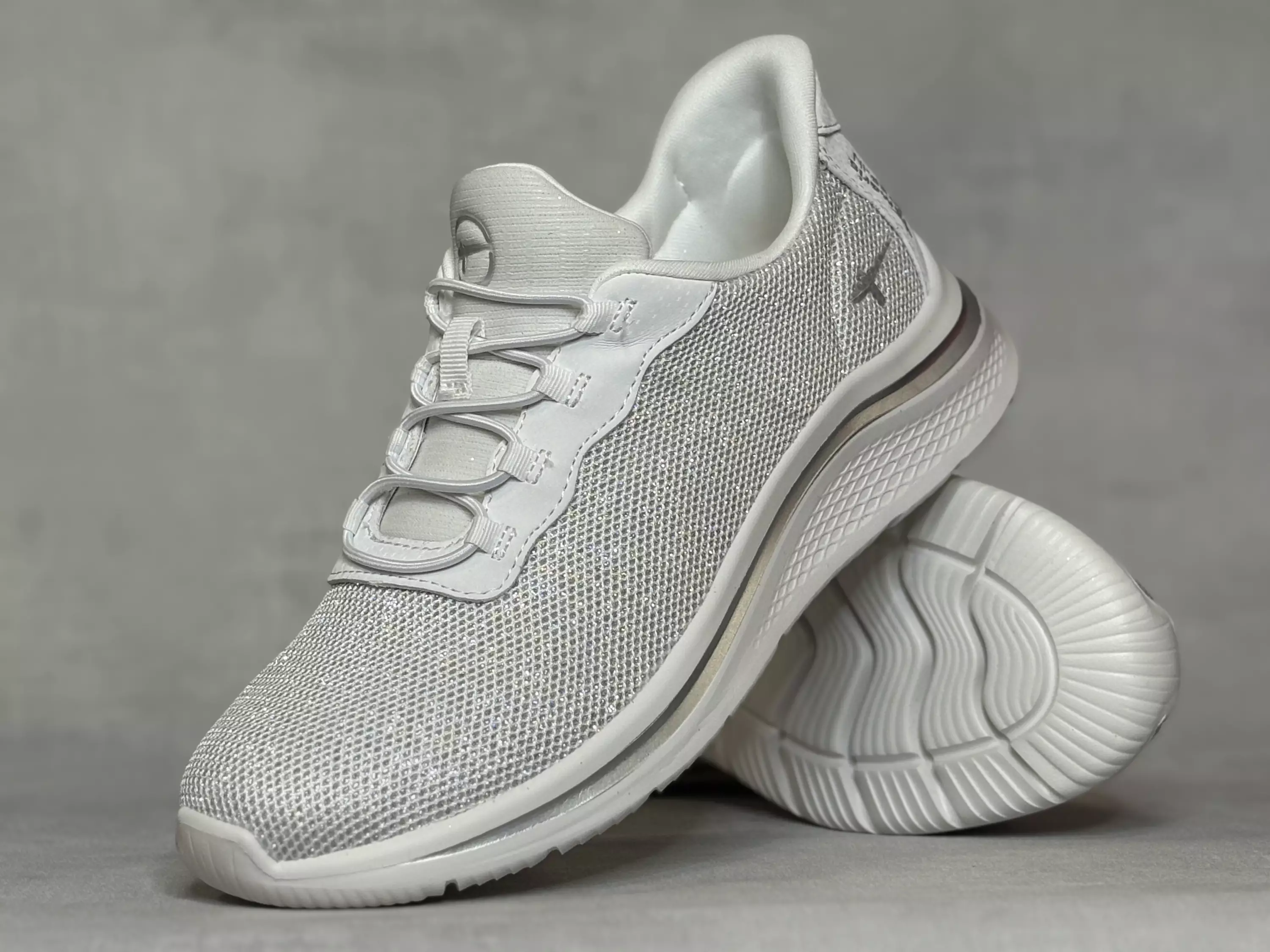 Hopea-valkoiset Tamaris Comfort kävelykengät. Upea hopeankimaltava pinta, valkoinen iltti ja kantakappale, sekä nauhat. Ei mitään irtohileitä vaan suoraan kengän materiaaliin sisällytetty hopeankiilto. Step-in kenkälusikkakannalla varustetut tennarit on helppo pukea! Joustavat venykenauhat (eivät ole säädettävissä). Tamaris Comfort-pohjalliset ovat pehmeät ja vaihdettavissa, joten tarvittaessa sujautat kenkiin omia tarpeitasi parhaiten vastaavat pohjalliset. Lestimitoitus H. Kannan korkeus noin 3cm ja pohjan korkeus päkiän alta noin 2cm.