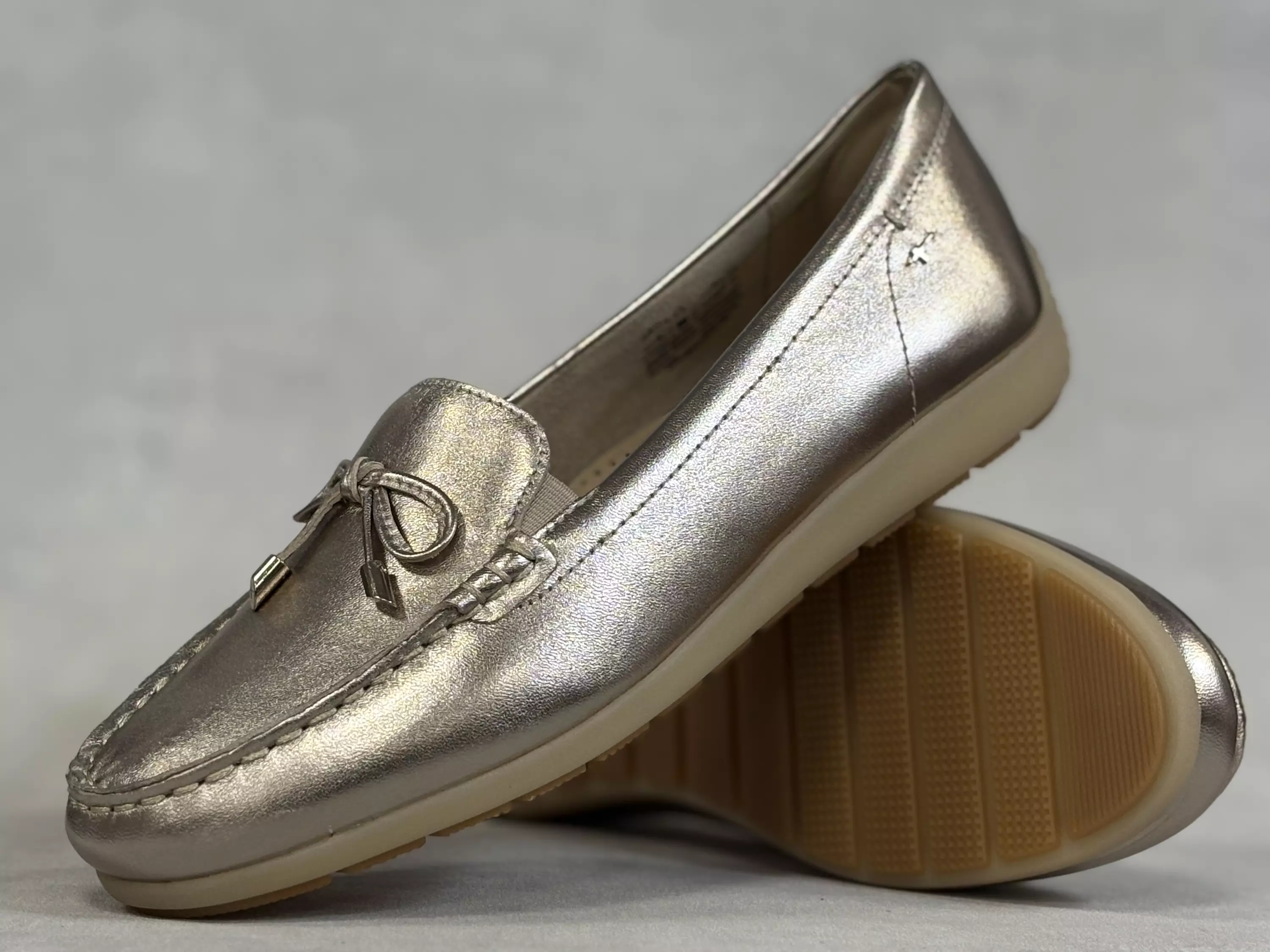 Kultaiset Tamaris Comfort White nappa loaferit. Nahkaiset loaferit purjehduskengille tyypillisellä mokkasiinimallisella kärjellä sekä koristerusetilla. Ulkosyrjällä yksityiskohtana metallinen, hopean värinen Tamariksen -logo. Kengän kannassa pehmustus, niinsanottu sisäänrakennettu sukansuoja, joka estää kantapäätä nousemasta kengästä. Lestimitoitus Tamaris Wide Fit, eli leveähkö H-lesti. Kevyesti muotoillut vaihdettavat pojalliset, joten tarvittaessa sujautat kenkiin omia tarpeitasi parhaiten vastaavat pohjalliset. Kannan korkeus noin 2cm ja pohjan korkeus päkiän alta noin 1cm.