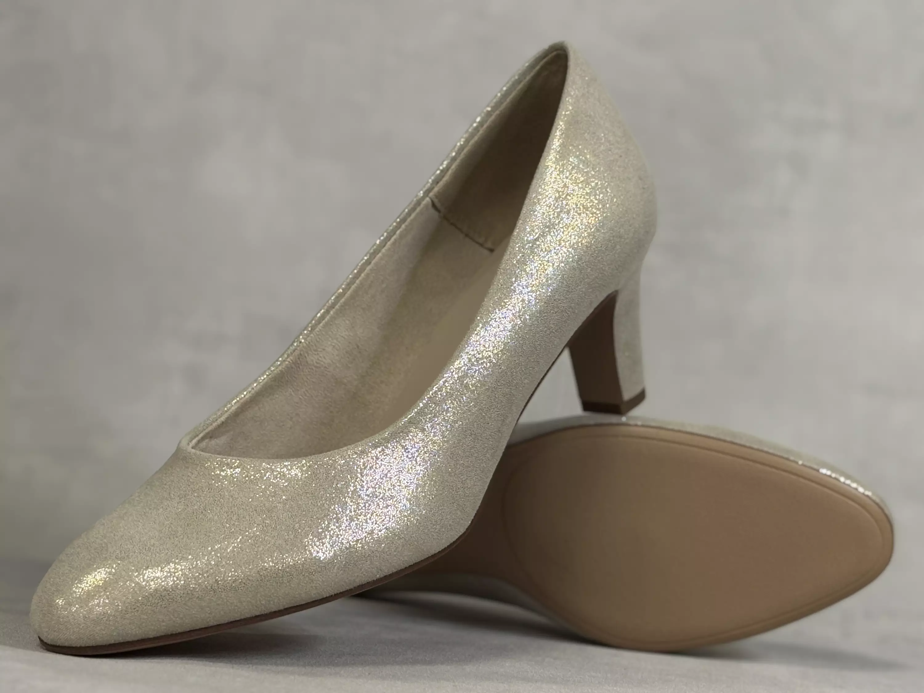 Kimaltavat beiget Tamaris Champagne korkokengät. Upeasti kimaltavat tekstiilipintaiset korkokengät. Tyylikkäät hieman kapenevat kärjet. Lestimitoitus kapeahko F½. 6cm korkea korko, pohjan korkeus päkiän alta noin 0,5cm.