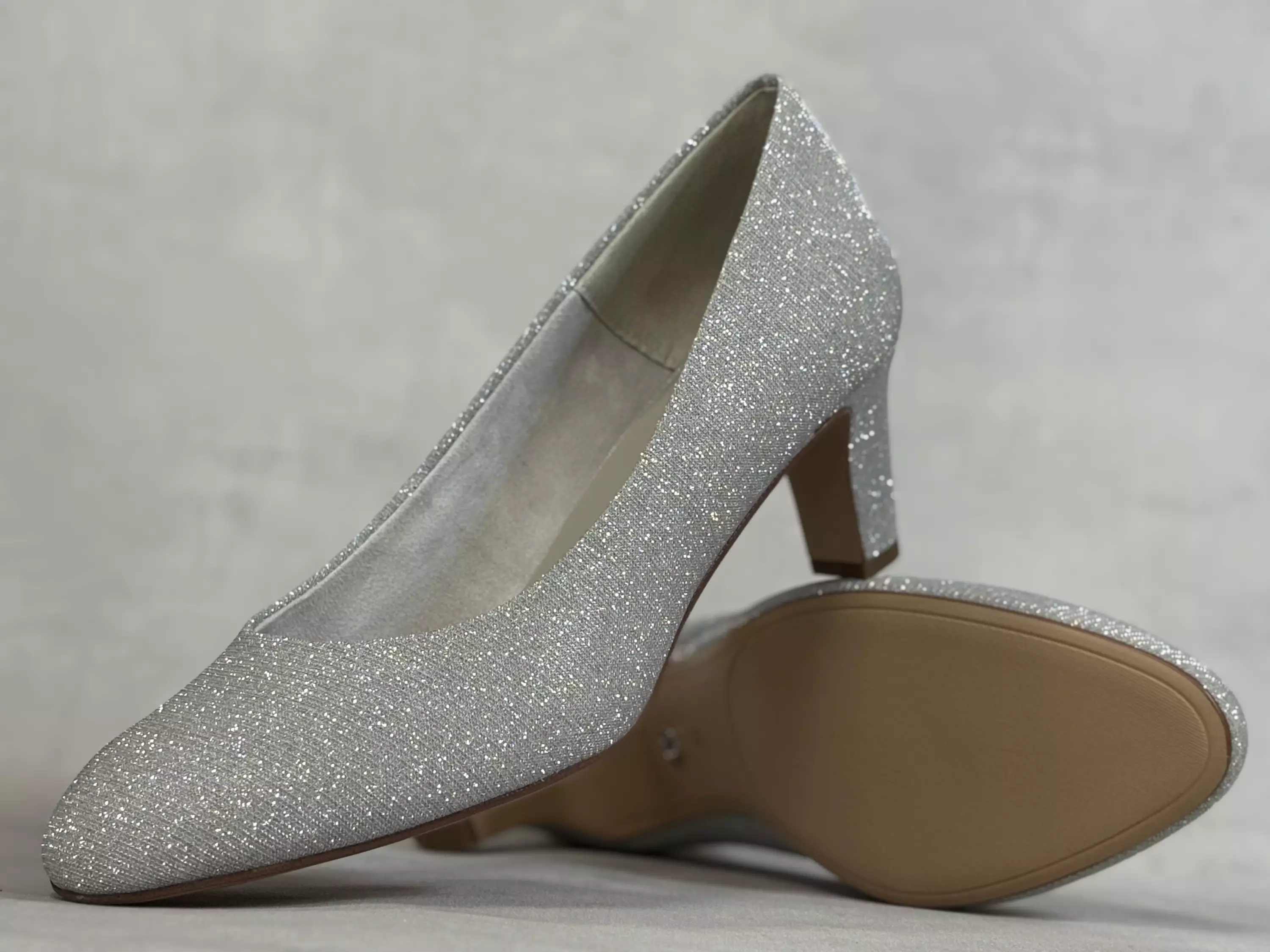 Kimaltavat hopeiset Tamaris Silver Glam korkokengät. Tekstiilinen pinta, johon kimallus tulee langasta, ei siis varisevaa glitteriä! Lestimitoitus kapeahko F½. Kannan korkeus noin 6cm ja pohjan korkeus päkiän alta noin 0,5cm.