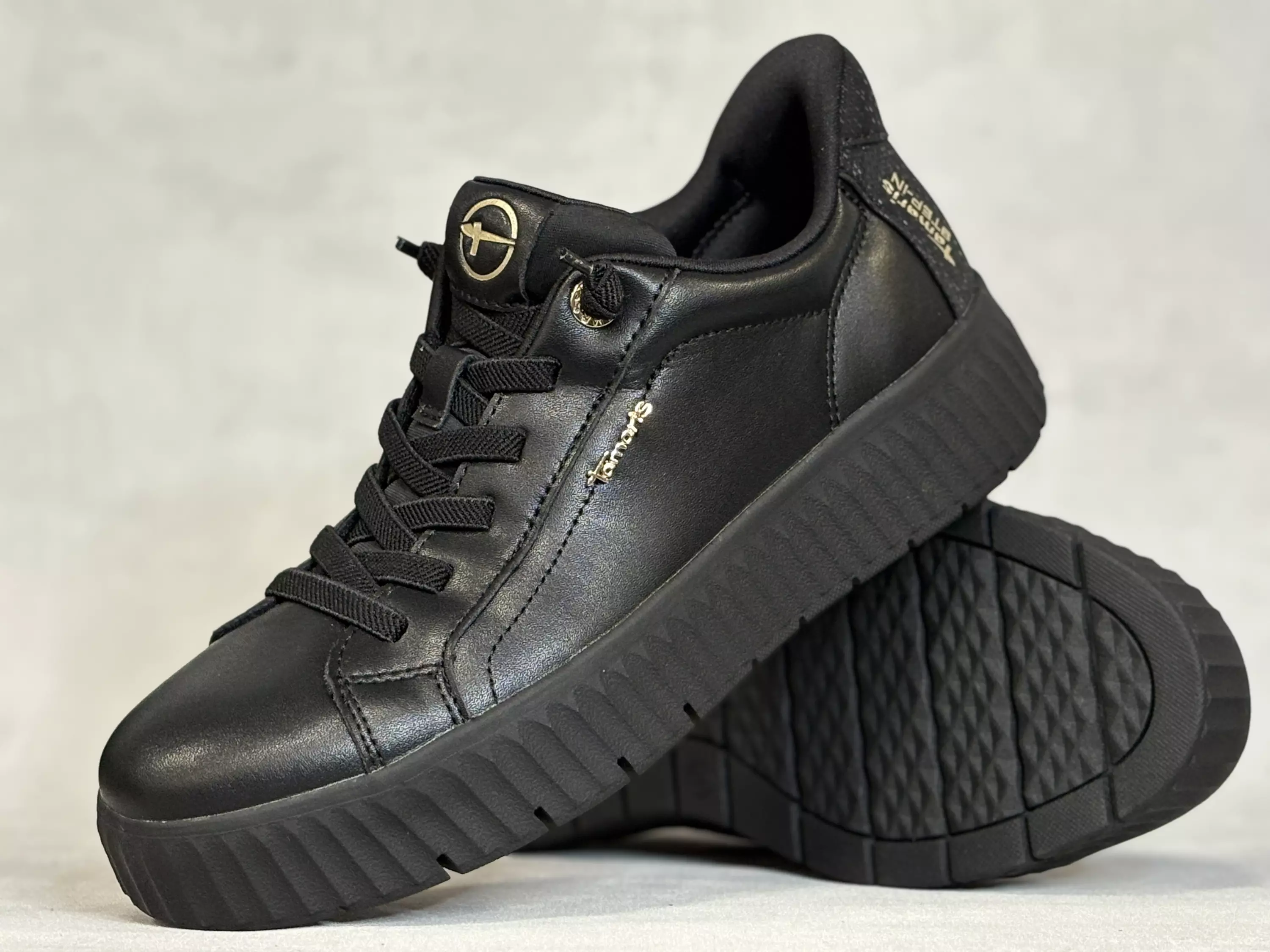 Mustat Tamaris Comfort tennarit. Step-in kenkälusikkakannalla varustetut kävelykengät sujahtavat vaivattomasti jalkaan! Joustavat venykenauhat antavat kengille ilmettä. Ulkosyrjällä metallinen kullan värinen Tamaris-merkki, kannassa kohokuvioitu Tamaris Step-in-teksti. Tamaris Comfort Wide fit, lestimitoitus H. Vaihdettavat pohjalliset, joten tarvittaessa sujautat kenkiin omia tarpeitasi parhaiten vastaavat pohjalliset. Kannan korkeus noin 4cm ja pohjan korkeus päkiän alta noin 2cm.