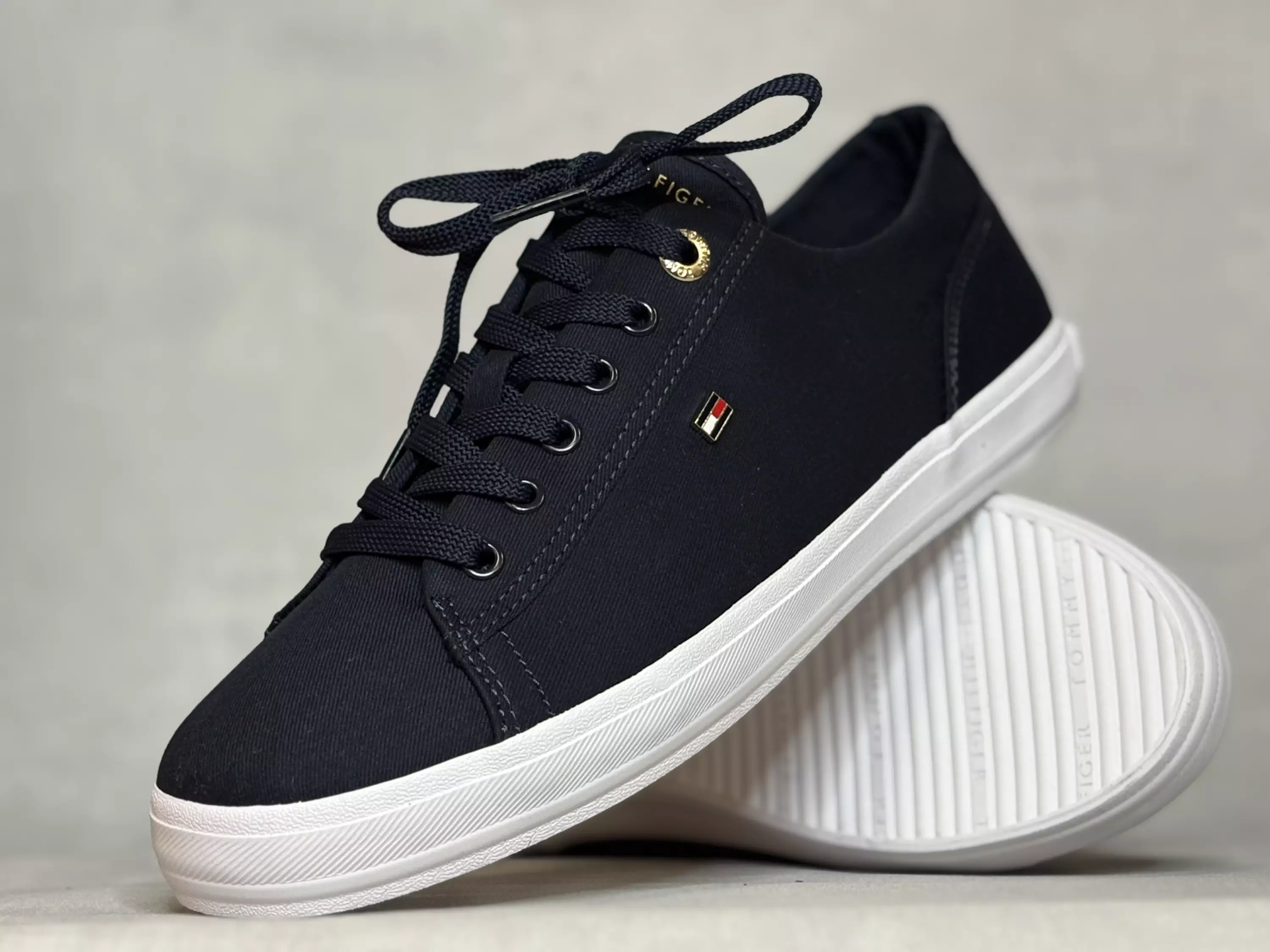 Tummansiniset Tommy Hilfiger Foxing Sneaker Canvas tennarit. Tekstiilipintaiset klassiset tennarit. Nauhojen avulla kengät säätyvät helposti jalkaan sopiviksi. Lesttimitoitus normaali G. Vaihdettavat pohjalliset, joiden tilalle sujautat tarvittaessa helposti omia tarpeitasi parhaiten vastaavat pohjalliset. Kannan korkeus noin 2cm ja pohjan korkeus päkiän alta noin 1,5cm.