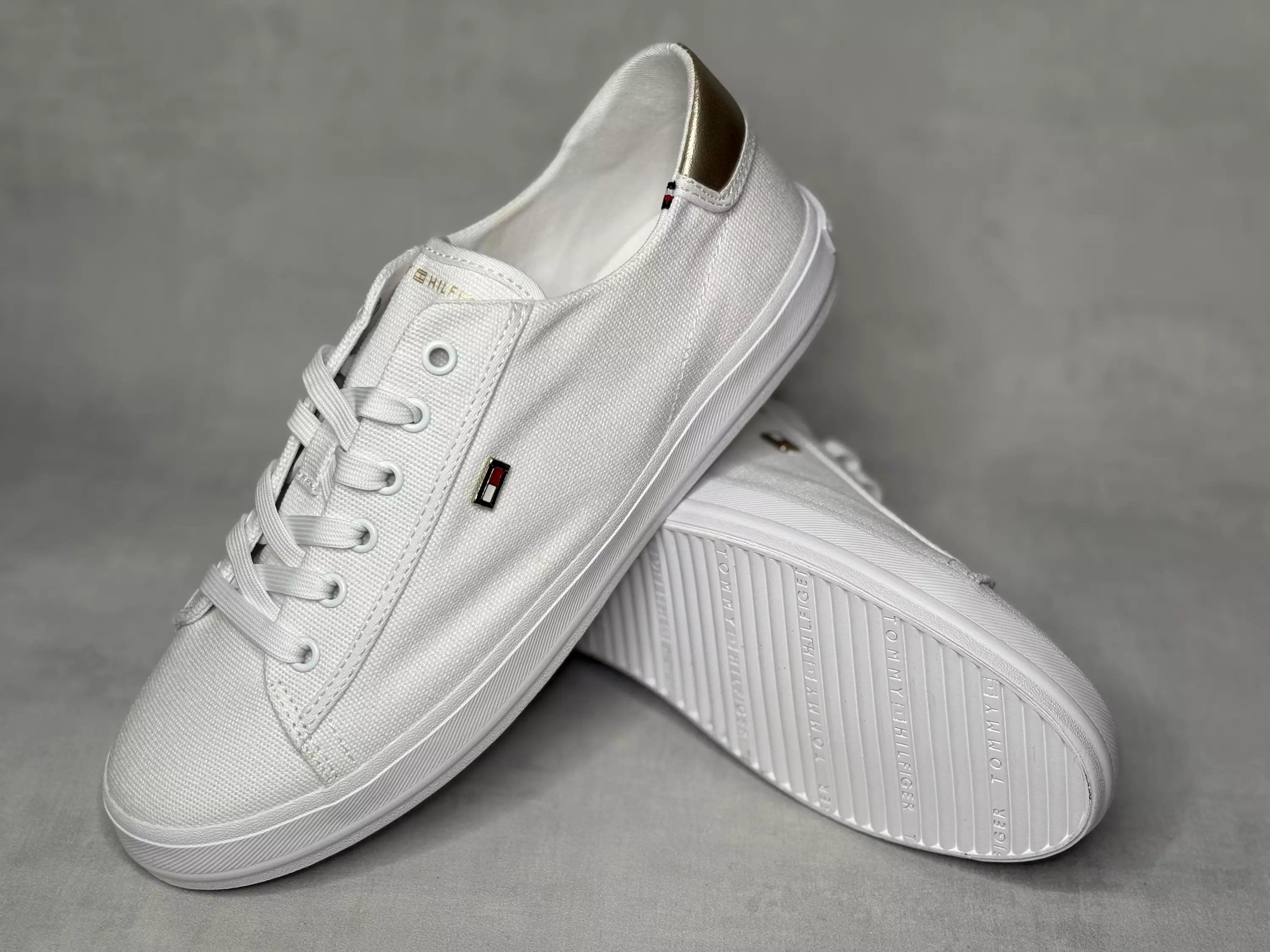 Valkoiset Tommy Hilfiger Vulc Canvas Lace Up Sneaker tennarit. Matalavartiset nauhalliset tennarit. Ulkosyrjällä nauhoituksen alapuolella metallinen Tommy Hilfiger lippulogo. Kantakappaleen yläreunassa yksityiskohtana kullanvärinen osio ja iltissä kullanvärinen Tommy Hilfiger-teksti.