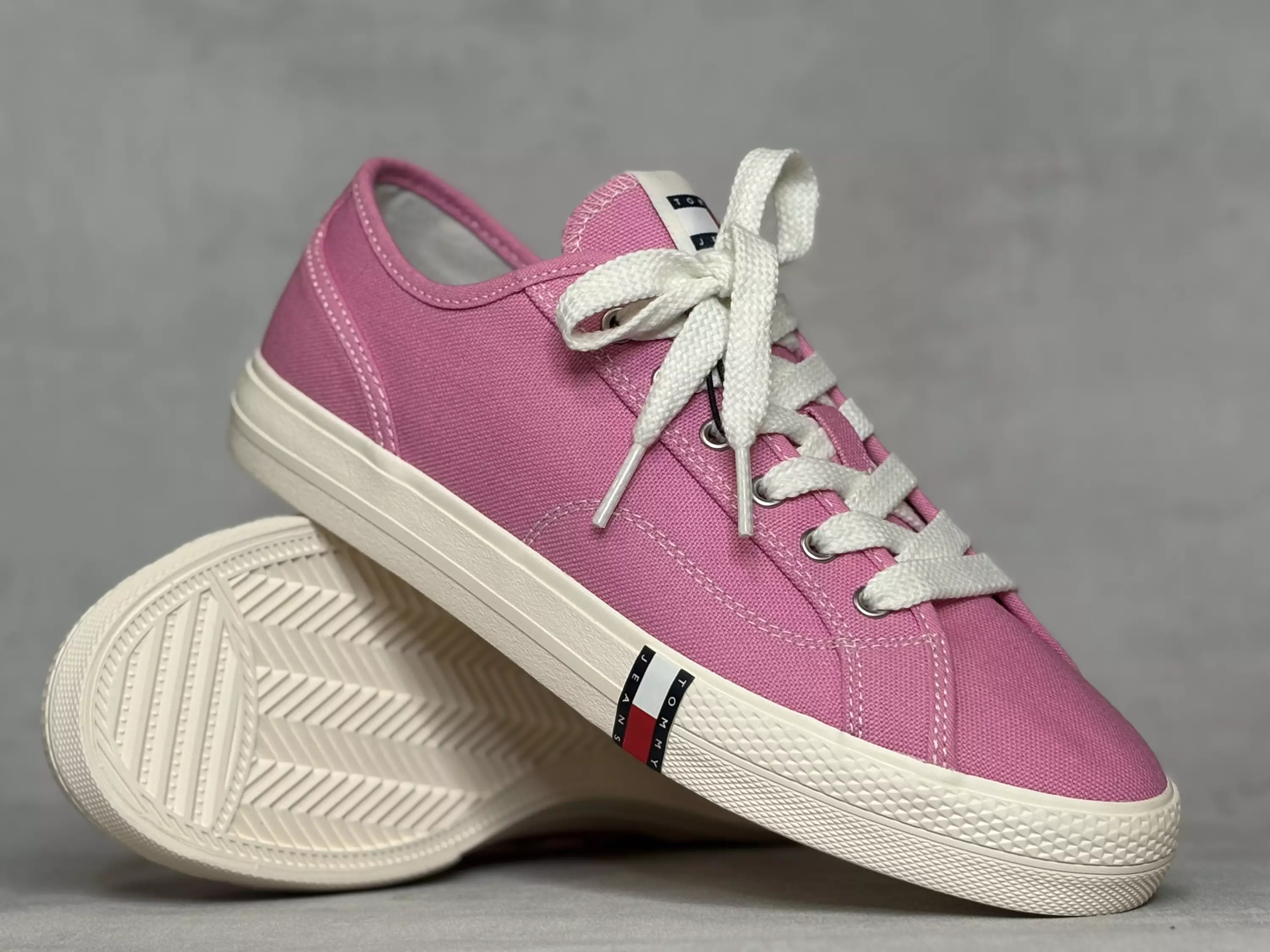 Vaaleanpunaiset Tommy Jeans - Archive Y2K - Synthetic Blush tennarit. Klassiset valkopohjaiset tekstiilitennarit. Ulkosyrjällä pohjan sivussa pieni Tommy Jeans lippu-logo. Vaihdettavat pohjalliset, joiden tilalle sujautat tarvittaessa omia tarpeitasi parhaiten vastaavat pohjalliset. Normaali lestimitoitus (G). Kannan korkeus noin 2cm ja pohjan korkeus päkiän alta noin 1,5cm.