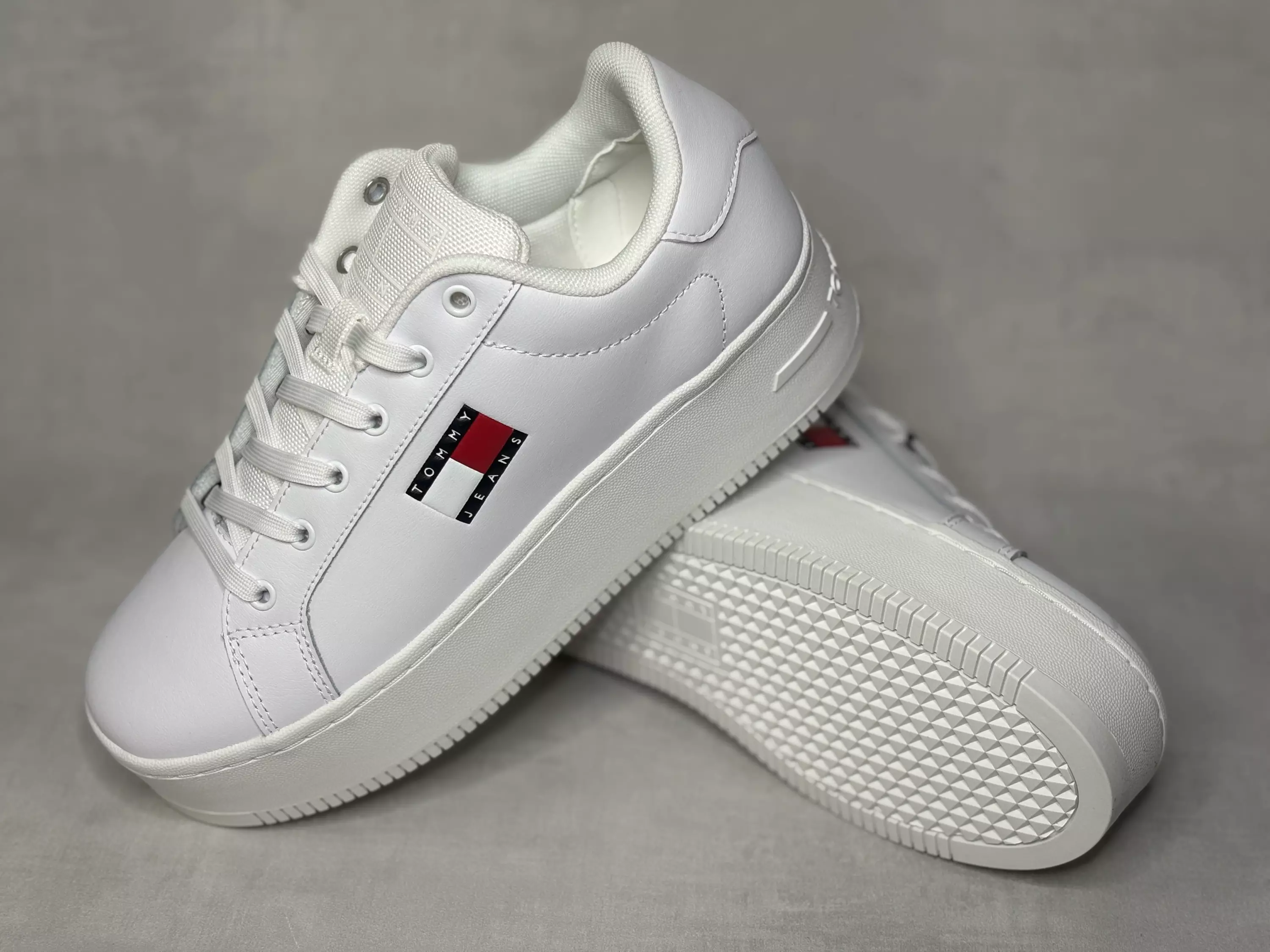 Valkoiset Tommy Jeans - White TJW Flatform tennarit. Paksupohjaiset tennarit ovat saaneet koristuksekseen Tommy Jeans lippulogon. Valkoinen ulkopohja. Nauhojen avulla kiristät kengät omaan jalkaan sopivan kireälle. Kevyesti muotoillut vaihdettavat pohjalliset, joiden tilalle sujautat tarvittaessa omaan jalkaasi parhaiten sopivat pohjalliset.