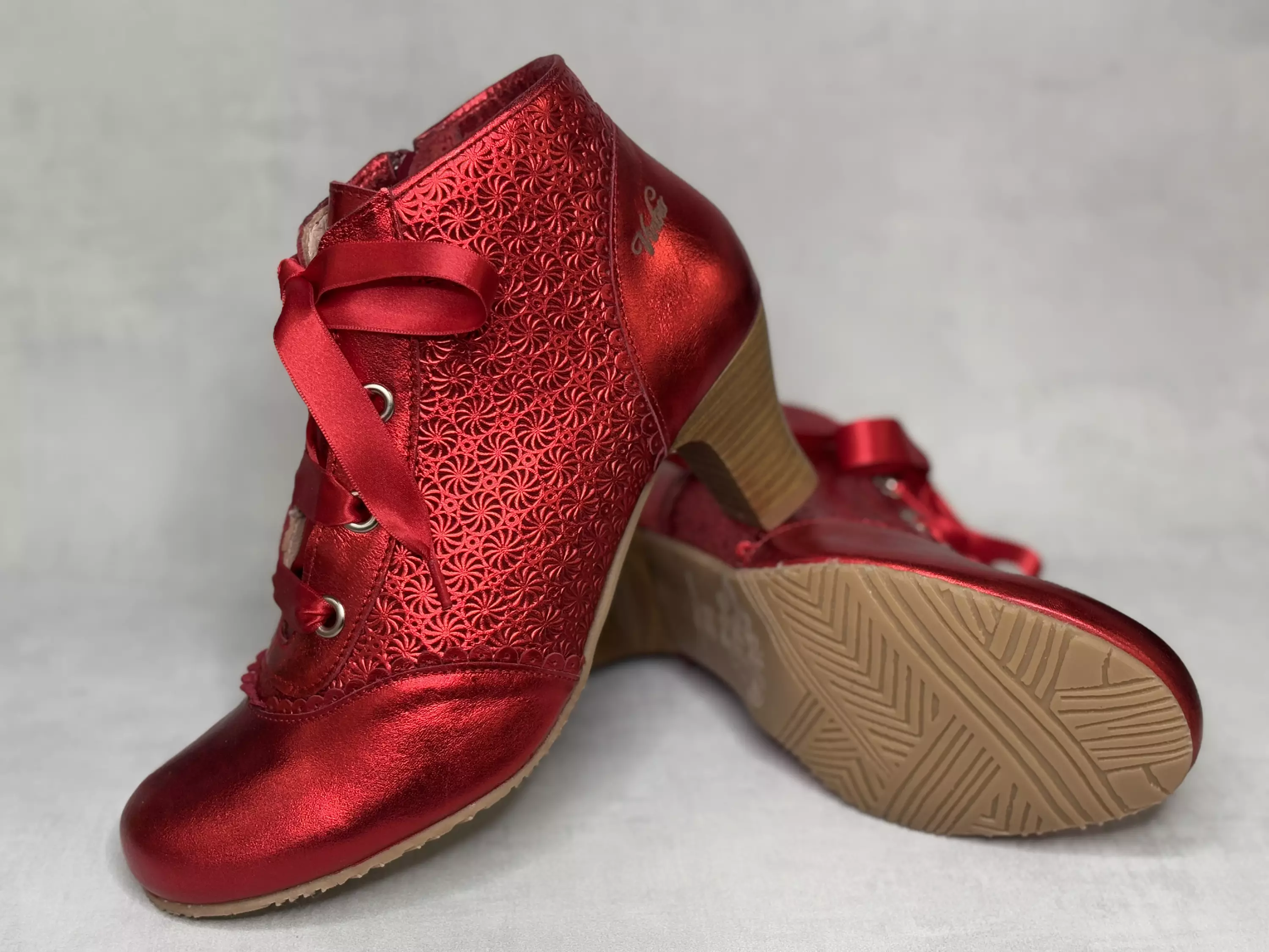 Metallinhohtoiset punaiset Vintro Amalia Clark Summer Red kävelykengät. Korolliset nilkkurit, joissa on upea perferoitu nahkapinta. Häikäisevän upea valoa taittava punainen väri, piparireunaiset yksityiskohdat kärjessä ja kannassa. Suunniteltu Suomessa suomalaiseen jalkaan sopivaksi, joten lesti on mitoitukseltaan normaali/leveähkö. Varsin pyöreä kärki, jonka sisään varpaat mahtuvat mukavasti. Nahkainen kenkä myös mukautuu käytössä juuri sinun jalkaasi sopivaksi. Upeat satiiniset nauhat ja sisäsyrjälle sijoitettu pukemista helpottava vetoketju. Noin 6cm korkea kanta, pohjan korkeus päkiän alta noin 1cm.
