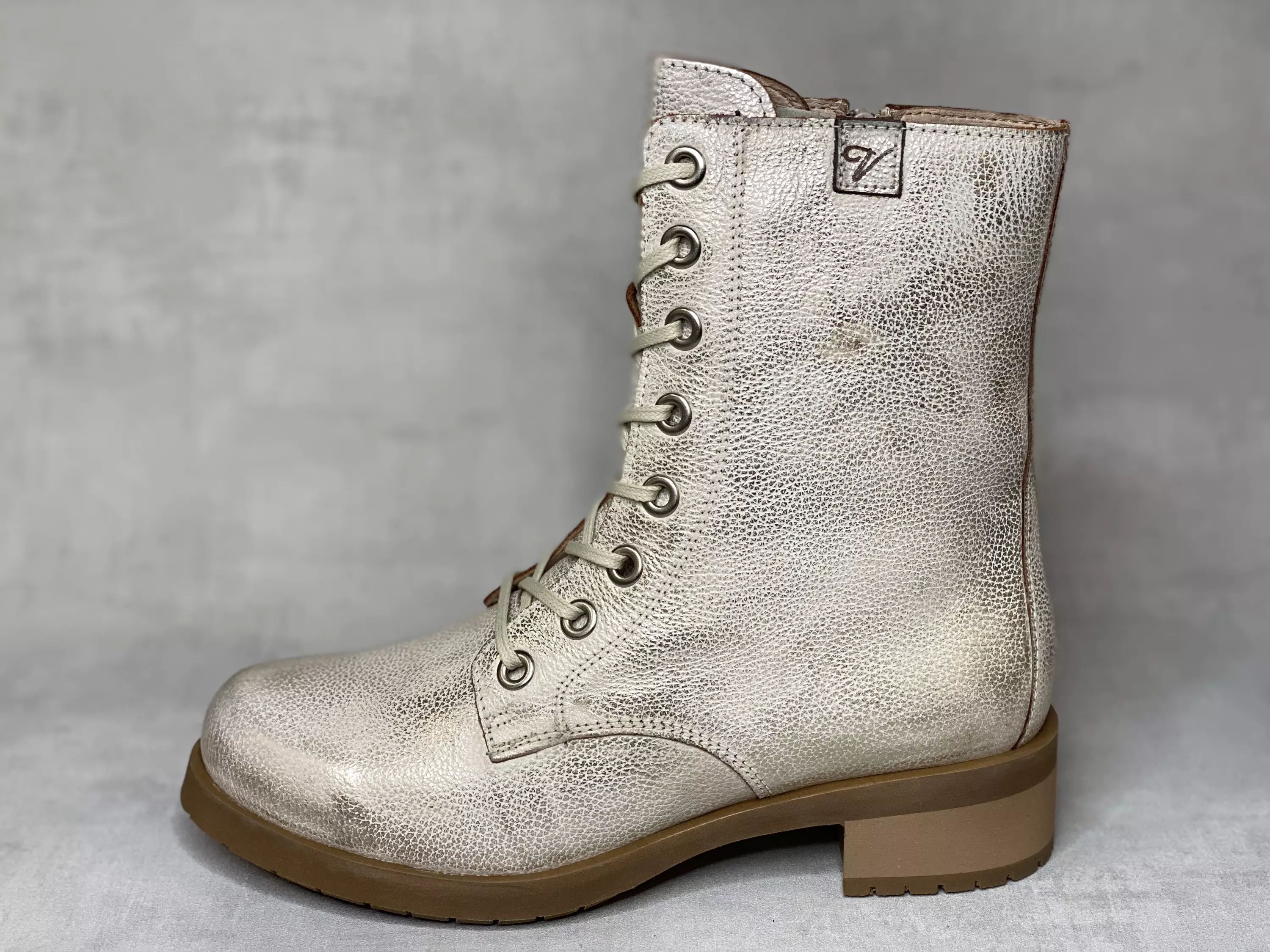 Metallinhohtoisen beiget nahkavuoriset Vintro Kaste maiharit. Ohuella nahkavuorilla varustetut maiharit sopivat mainiosti kevät- ja kesäkäyttöön! Vaaleanruskea ulkopohja. Nauhoilla maiharit säätyvät sujuvasti omaan jalkaan sopivan kireälle ja sisäsyrjän vetoketju vauhdittaa pukemista.