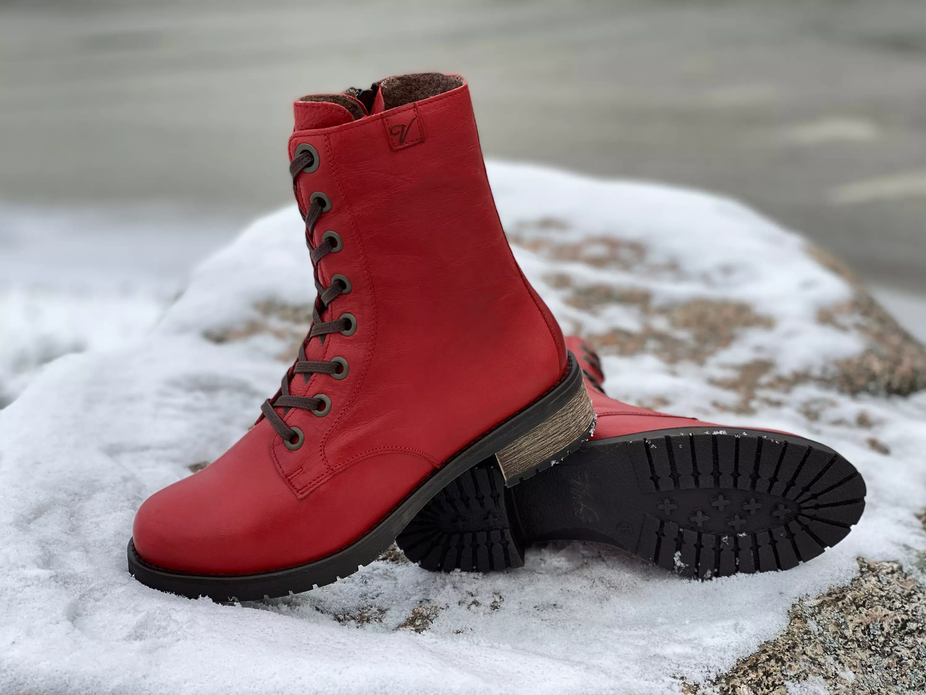 Mahtavat Vintro maiharit, tällä kertaa upeassa punaisessa sävyssä! Nauhoilla kenkä säätyy upeasti omaan jalkaan sopivaksi ja sisäsyrjän vetoketju helpottaa pukemista. Tämä maihari on laadukasta nahkaa ja se on kyllästetty vettähylkiväksi. Tämä kyllästys tulee uudistaa säännöllisesti esimerkiksi Pedag Waterproofer suojasuihkeella. Suojasuihkeeksi käy mainiosti myös Collonil Carbon Pro-suojasuihke. Kengän vuori on lämmintä ja hengittävää villasekoitetta. Leveälestiset maiharit.