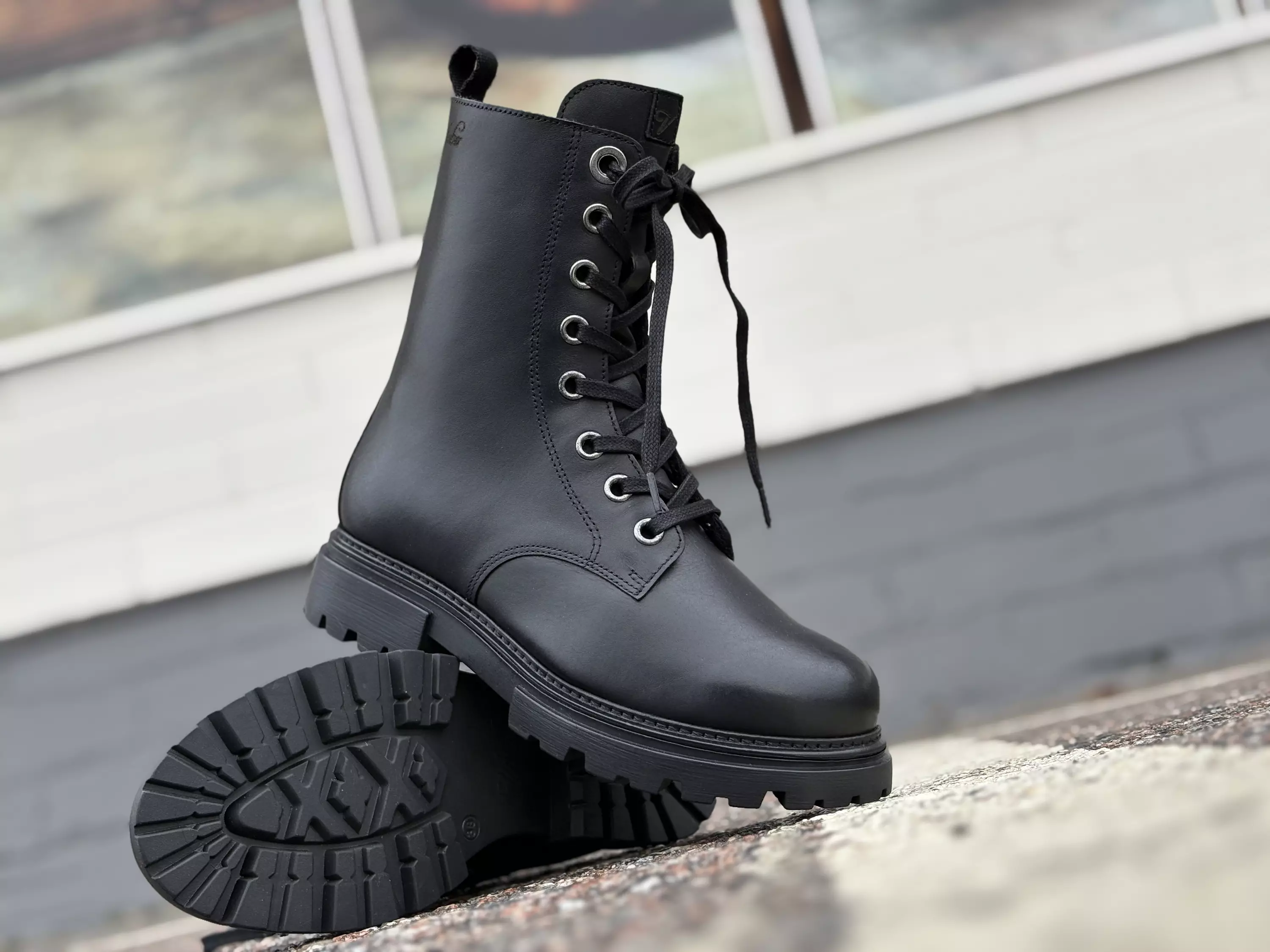 Klassiset Vintro maiharit, tällä kertaa muotivärissä musta! Perinteisistä maihareista tuttu, reilusti kuvioitu ulkopohja. Nauhoilla kenkä säätyy upeasti omaan jalkaan sopivaksi ja sisäsyrjän vetoketju helpottaa pukemista. Tämä maihari on laadukasta nahkaa ja se on kyllästetty vettähylkiväksi. Tämä kyllästys tulee uudistaa säännöllisesti esimerkiksi Pedag Waterproofer suojasuihkeella. Suojasuihkeeksi käy mainiosti myös Collonil Carbon Pro-suojasuihke. Kengän vuori on lämmintä ja hengittävää villasekoitetta.