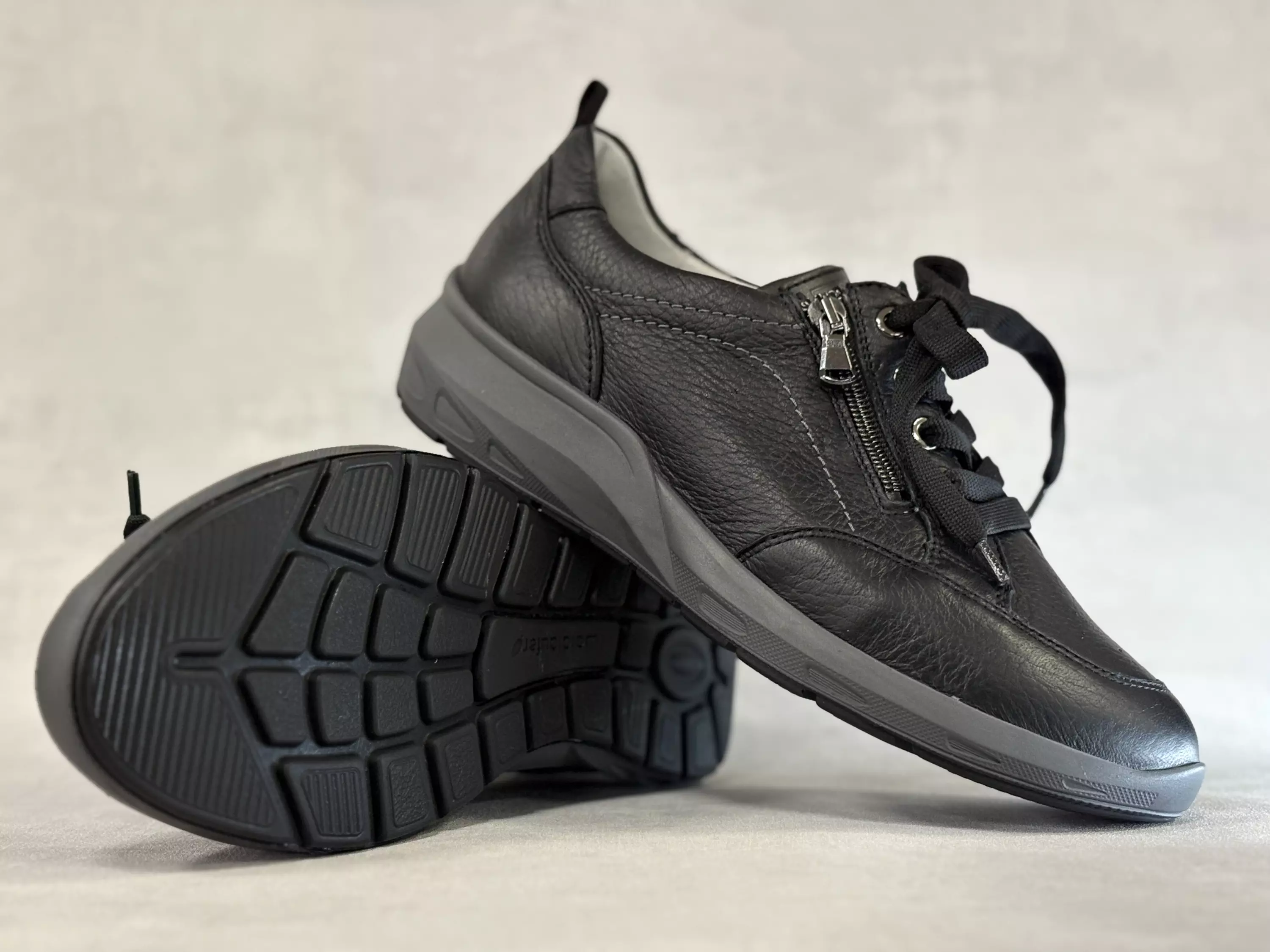 Mustat Walfläufer kävelykengät. Pehmeästä nahasta valmistetut leveälestiset kävelykengät, lestimitoitus M. Nauhojen avulla kengät on helppo säätää omaan jalkaan sopivalle kireydelle. Kaksi vetoketjua, joista toinen on sijoitettu ulkosyrjälle ja toinen sisäsyrjälle. Molemmat vetoketjut avaamalla kengät on helppo pukea kankeampaankin jalkaan. Pehmeät, kevyesti muotoillut pohjalliet ovat vaihdettavat, joten tarvittaessa sujautat kenkiin omia tarpeitasi parhaiten vastaavat pohjalliset. Kannan korkeus noin 3,5cm ja pohjan korkeus päkiän alta noin 1,5cm.